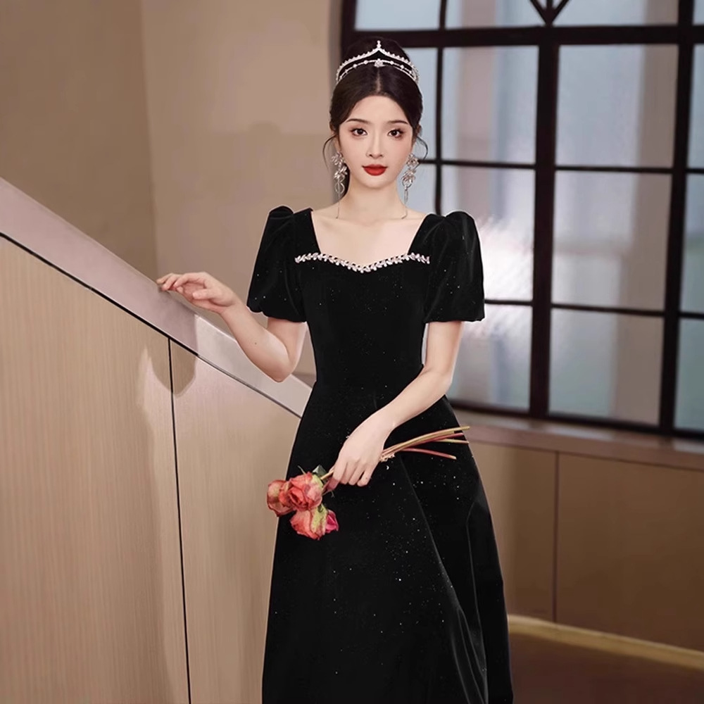 黒のイブニングドレス2025秋冬新作軽奢系小众ロングドレス美術試験宴会ドレス普段着
