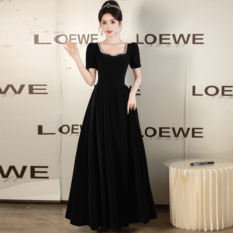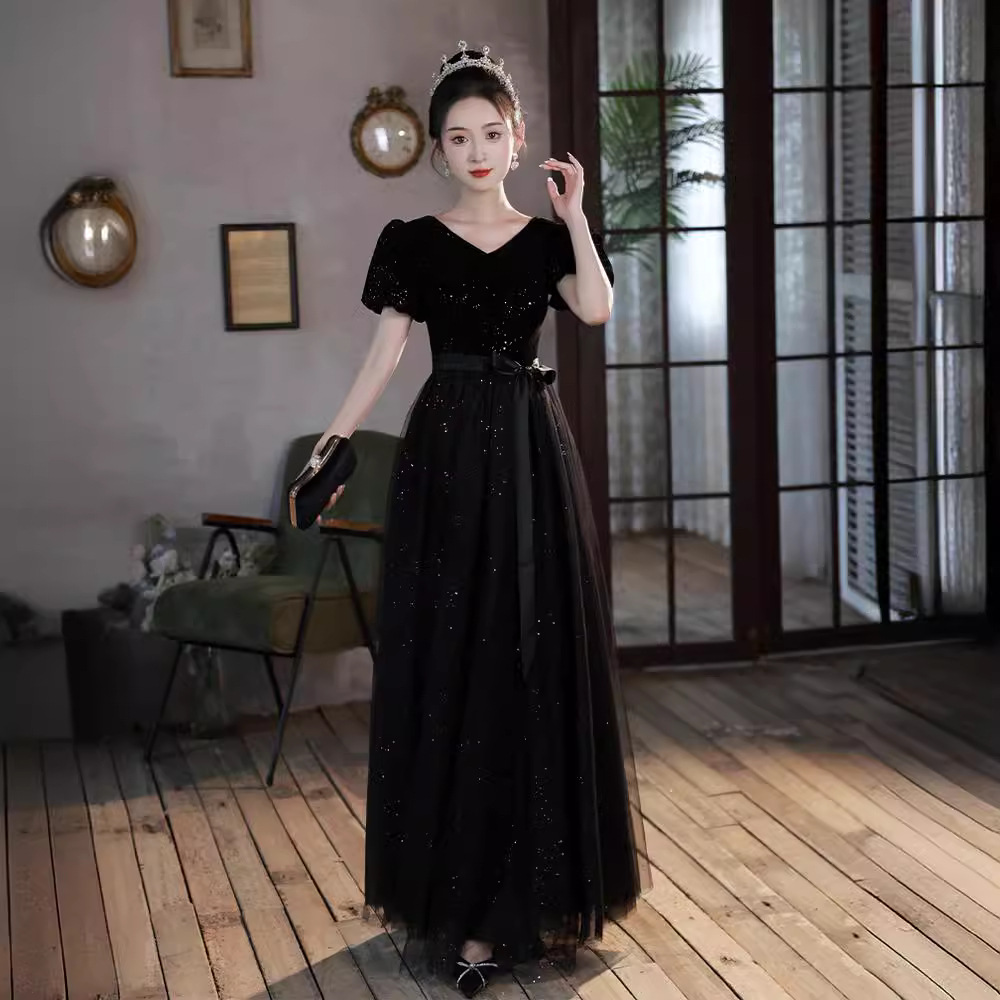 黒のイブニングドレス2025新作ベルベット光沢合唱衣装司会ドレス年長者向けロングドレス