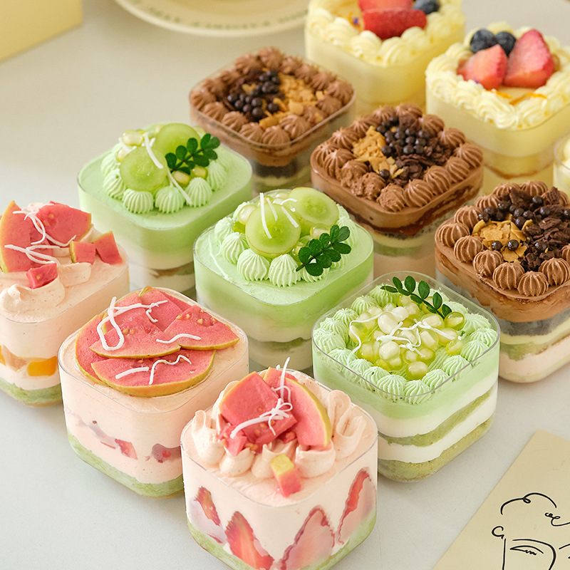 ケーキボックス包装箱、小さなティラミスムースデザート包装、クリーム入り正方形透明容器、越境専用