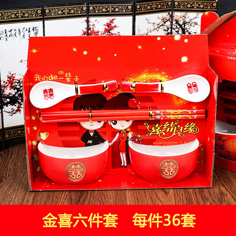 碗のギフトボックスの陶磁器の赤い碗の箸のセットの結婚のお返し用品の嫁入り用品の対碗の陶磁器の喜碗のお返しの結び