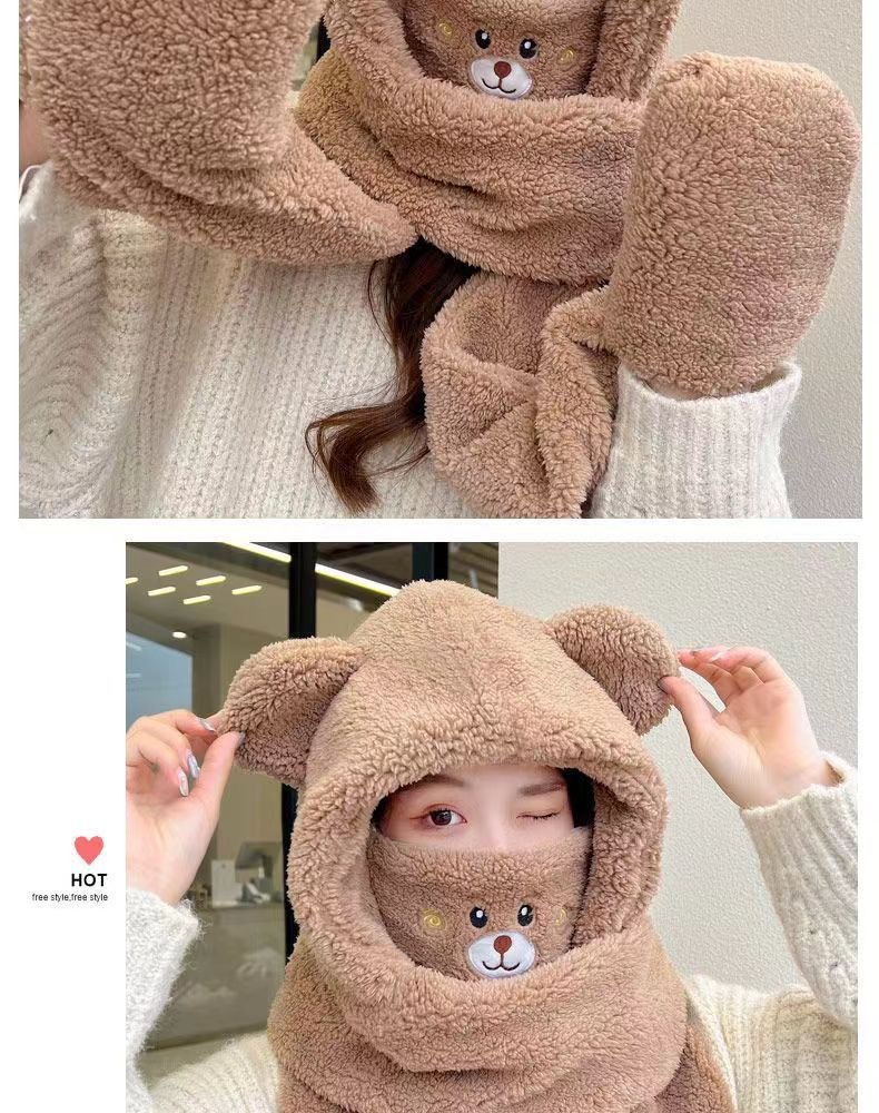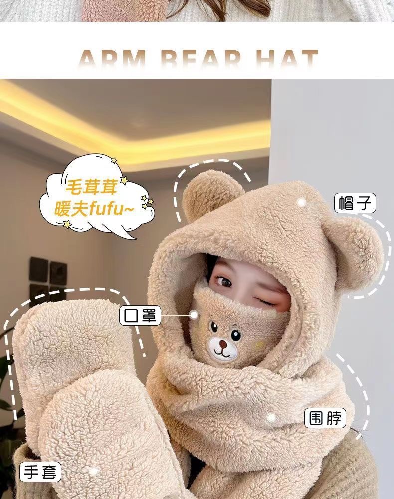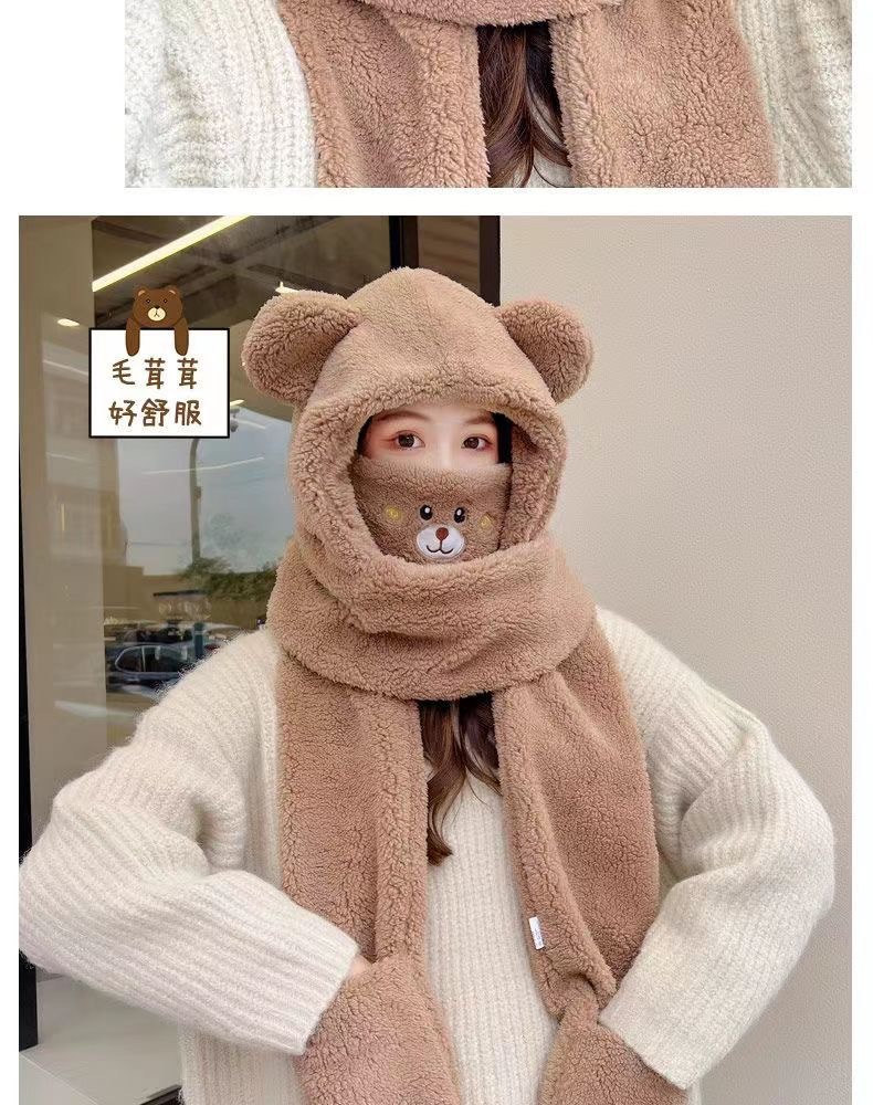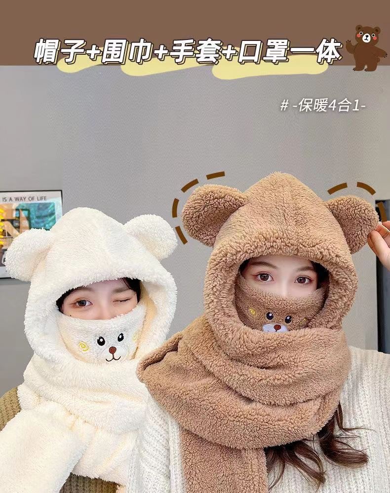 【保温五合一】冬の成人の連体帽子にベルベットをつけてかわいいベアー一体マスク帽子保温帽子を厚くする