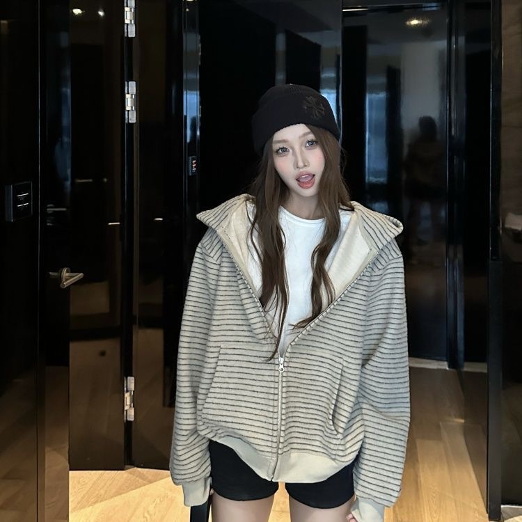 美式复古国潮港风条纹开衫连帽卫衣女装秋季百搭休闲宽松显瘦上衣
