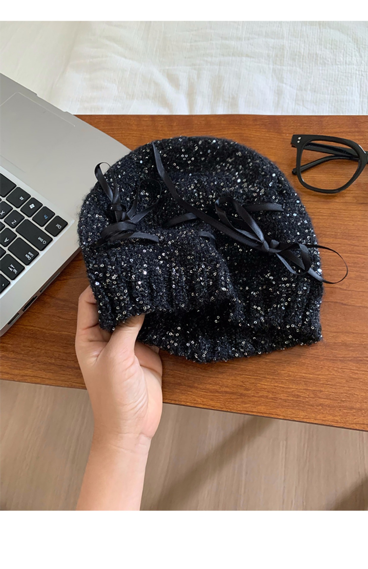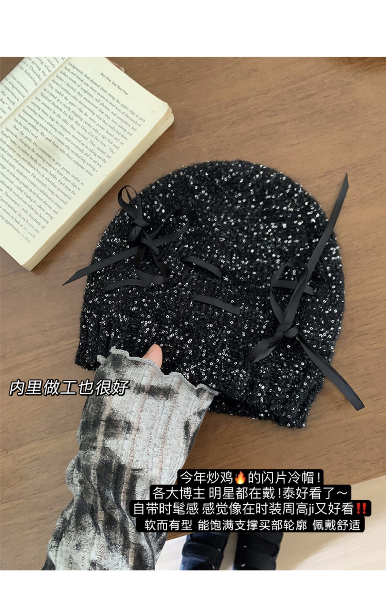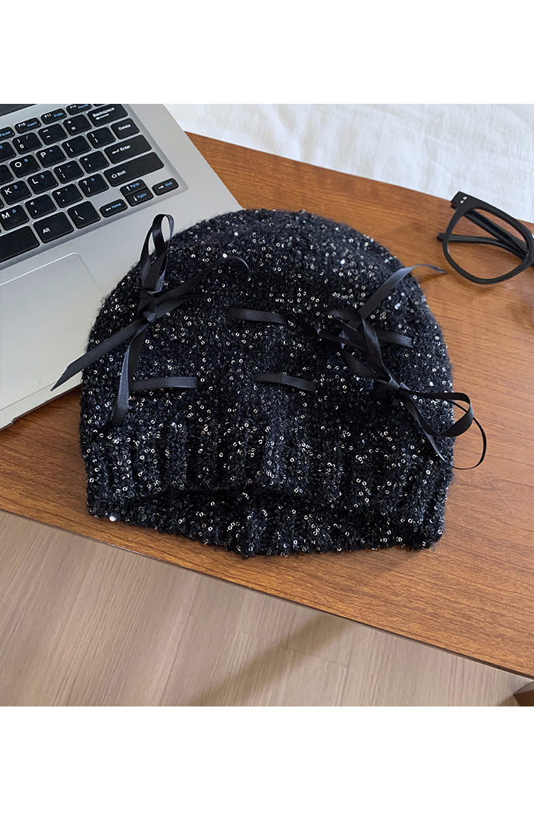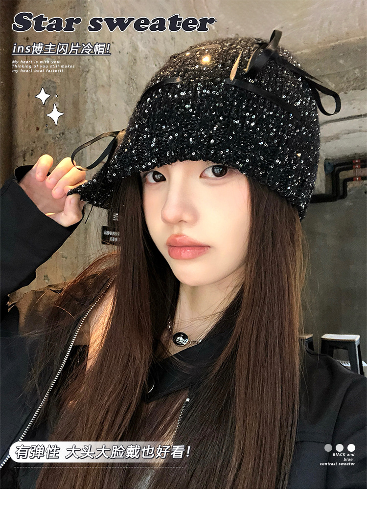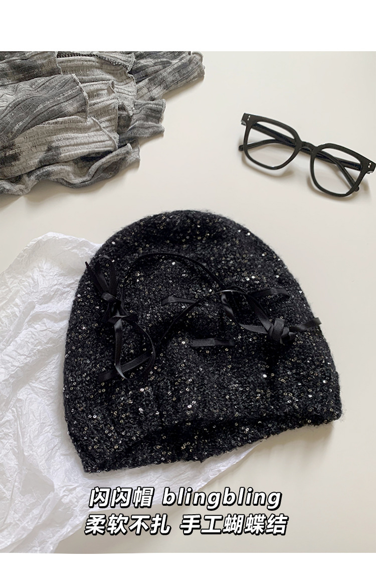 韓国版の蝶結びのスパンコールの冷たい帽子の女性の2024の新型の百合のギャルの包頭の帽子は顔の小さいメリヤスの山の帽子を見せます。
