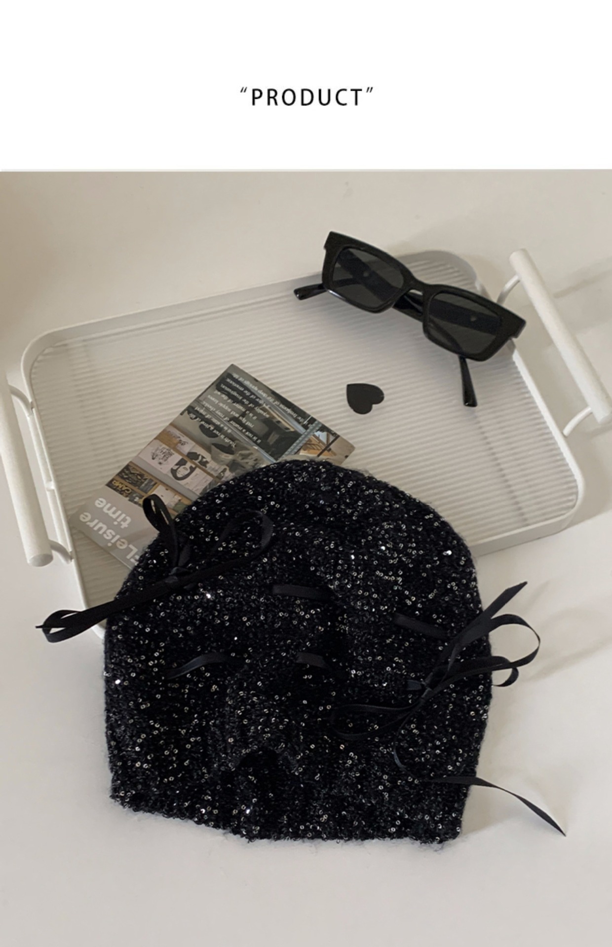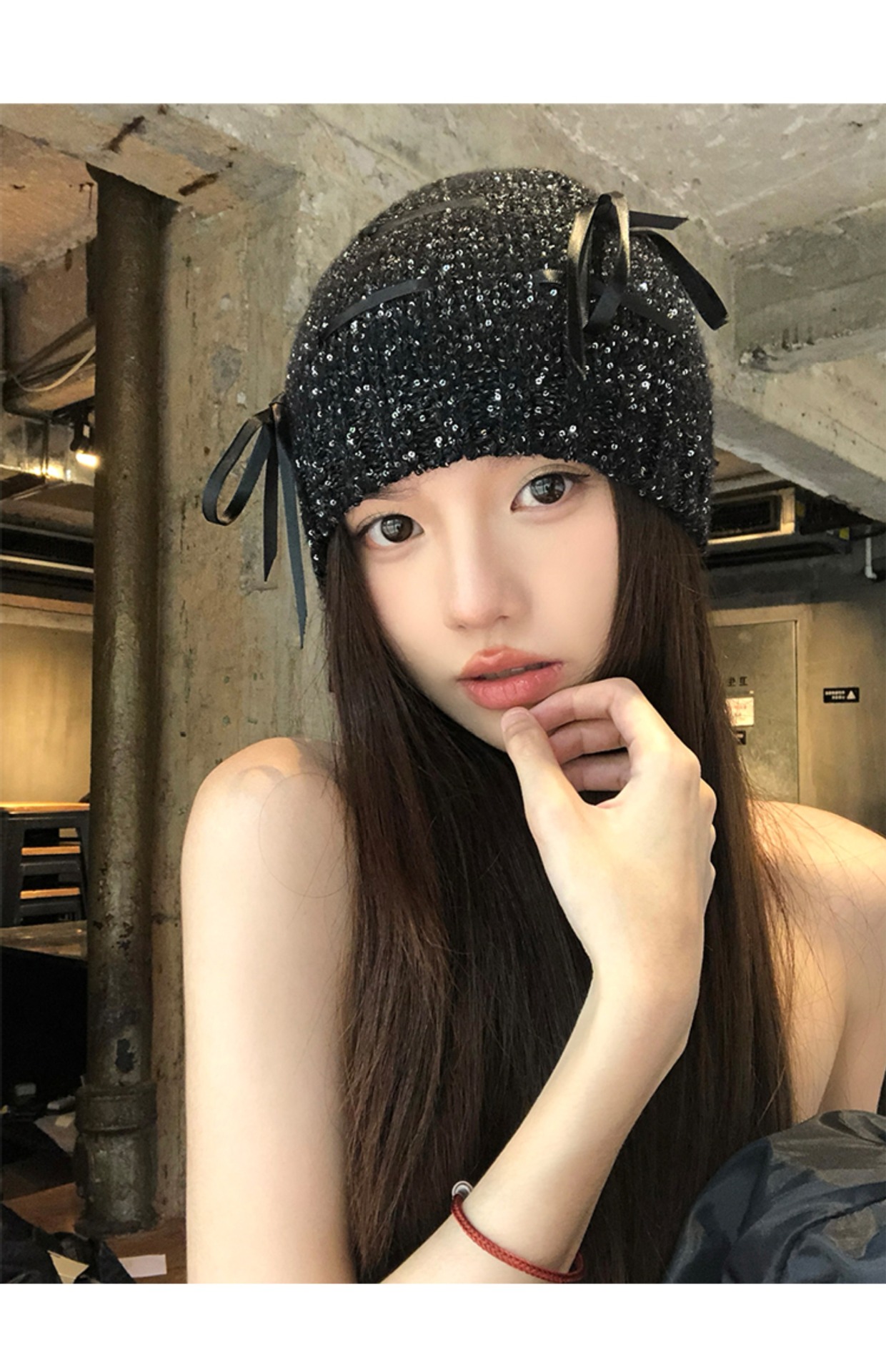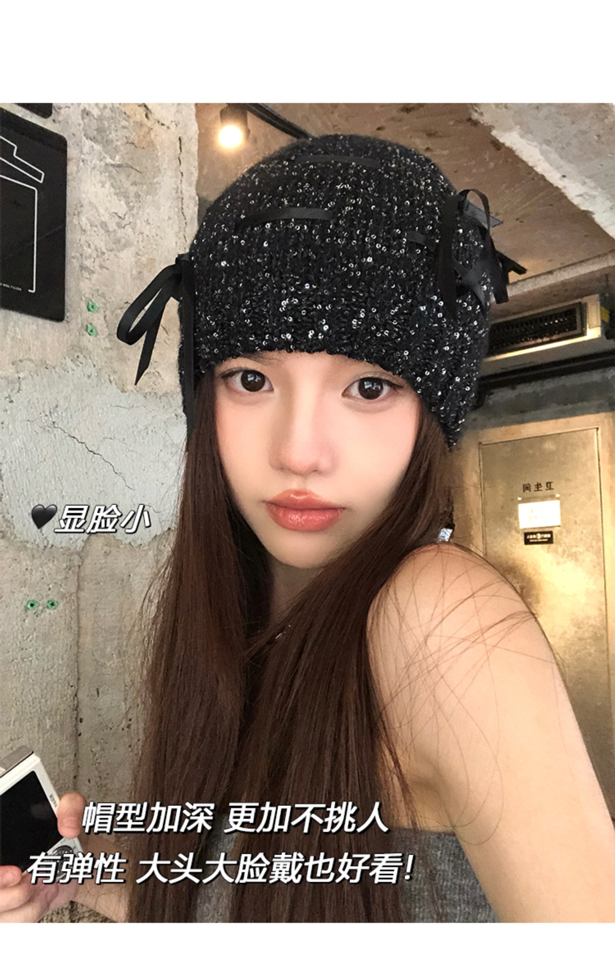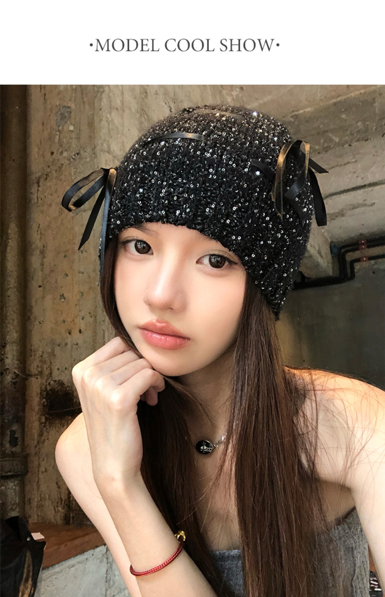 韓国版の蝶結びのスパンコールの冷たい帽子の女性の2024の新型の百合のギャルの包頭の帽子は顔の小さいメリヤスの山の帽子を見せます。