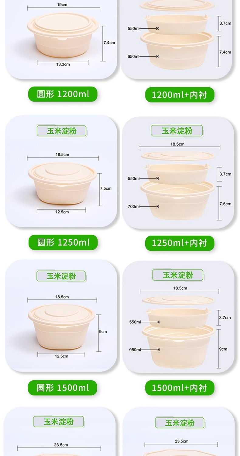 サイズ 320ml丸型,350ml丸型,400ml丸型,450ml丸型,500ml丸型,600ml丸型,650ml丸型,800ml丸型,900ml丸型,1000ml丸型,1200ml丸型,1200ml+裏地,1250ml丸型,1250ml+裏地,1500ml丸型,1500ml+裏地,1750ml丸型,1750ml+シングルコンパートメント裏地,1750mlラウンド+ダブルグリッド裏地,2000ml丸型,2500ml丸型,2500ml八角ボウル,380ml角型ランチボックス,500ml角型ランチボックス,650ml角型ランチボックス,650ml 長方形ダブルコンパートメント,700ml角型ランチボックス,800ml 長方形ダブルコンパートメント,850ml角型ランチボックス,1000ml角型ランチボックス,550mlロングシングルコンパートメント,550mlロングダブルコンパートメント,550ml均等分割ダブルコンパートメント,550ml ストリップ 3 コンパートメント
