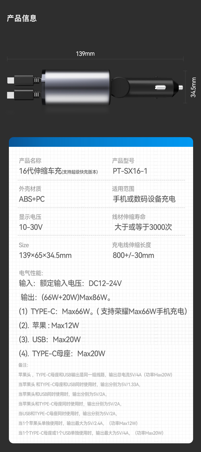 跨境星空顶汽车车载充电器超级快充伸缩线四合一多功能数显点烟器