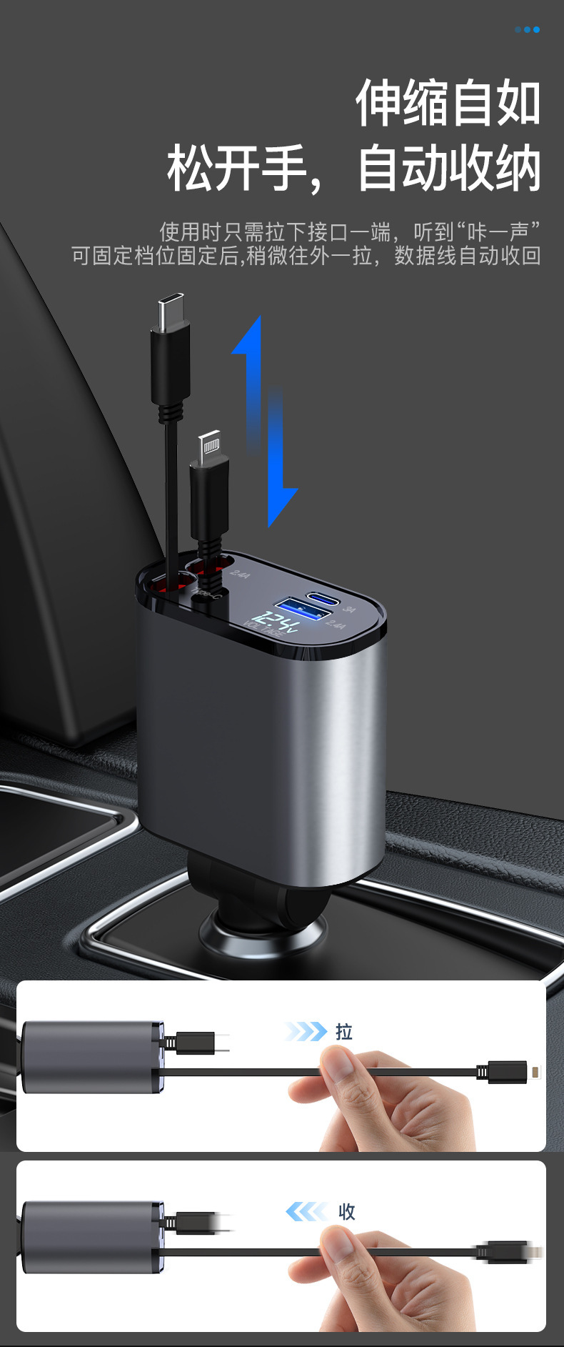 車の充電器デジタルディスプレイ超高速充電フラッシュ充電金属格納式ケーブルスリーインワン工場直販シガーライター車の充電器