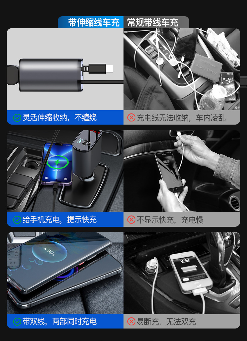 新型車載充電器120W超速充伸縮線多機能シガレット充電器一牽引二フラッシュ充電交換ヘッド