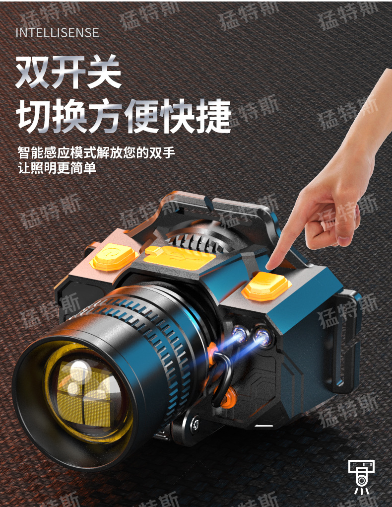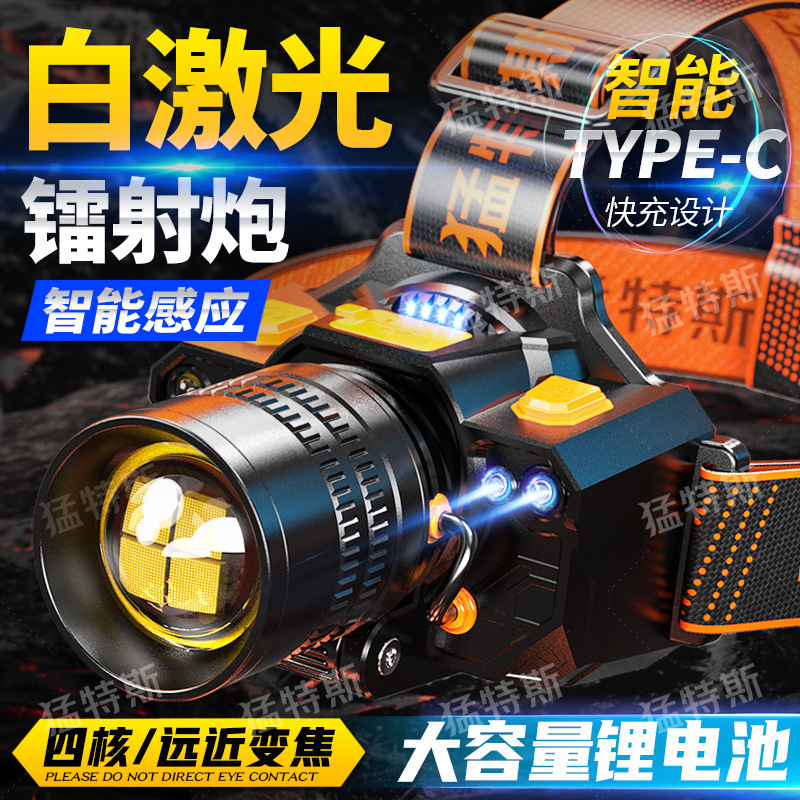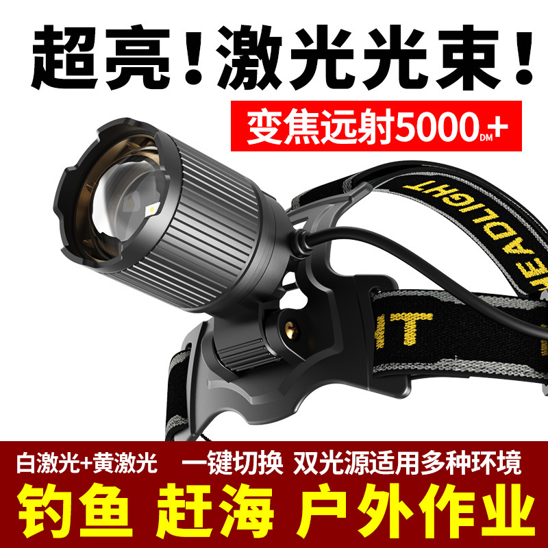 クロスボーダー二重光源感応ヘッドマウント黄色光白色光レーザー强い光充电ヘッドライトledズーム夜钓りライト