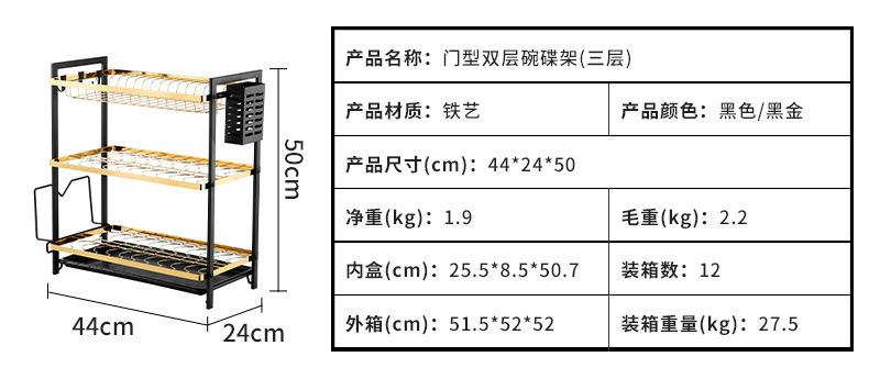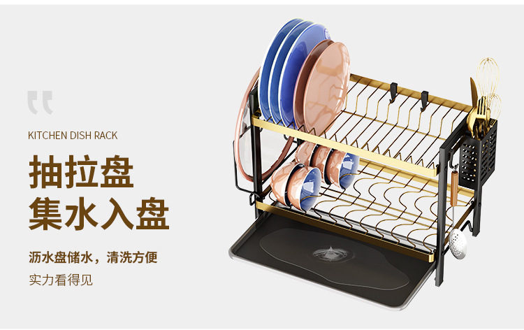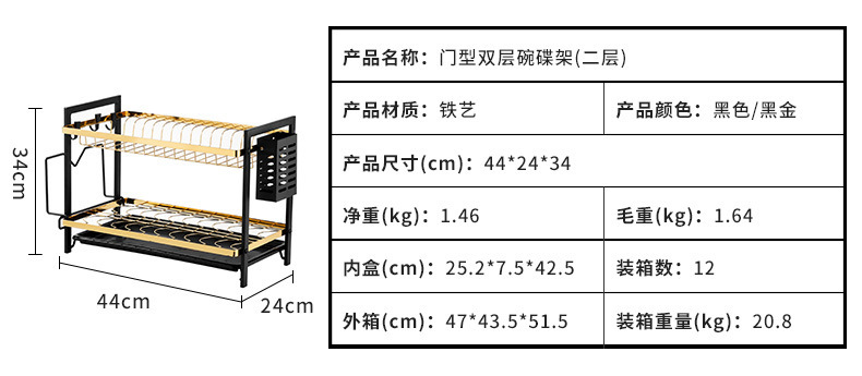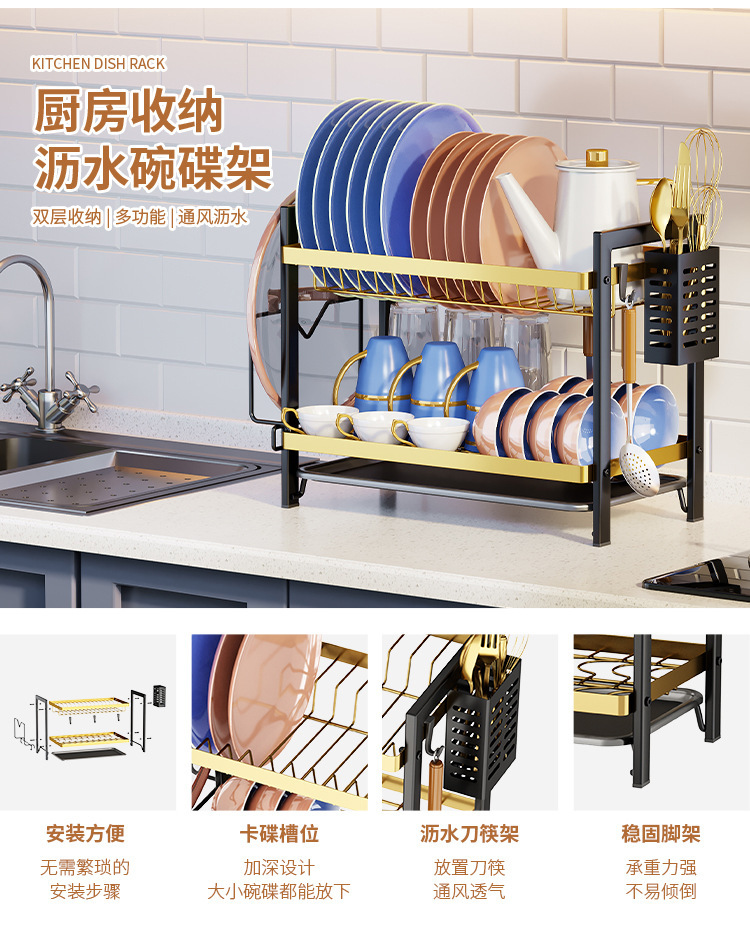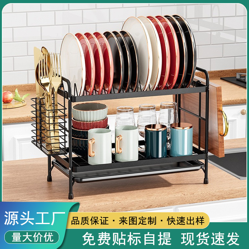 亚马逊跨境厨房碗碟收纳多功能铁艺置物架双层台面碗盘筷子沥水架