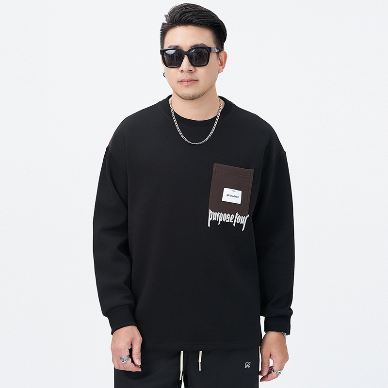 大码男装日系潮牌抽绳拼接印花口袋圆领长袖本布下摆宽松休闲卫衣