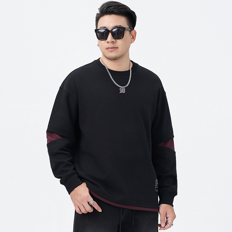 大码男装日系圆领卫衣复古假两件撞色拼接休闲宽松男式长袖套头衫