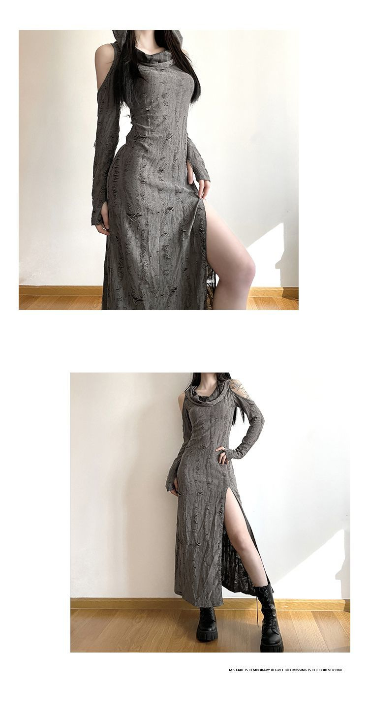 廃土風アメリカ破穴ワンピース女性2024秋の薄いギャルデザイン感の中で長いフォークスカート女性