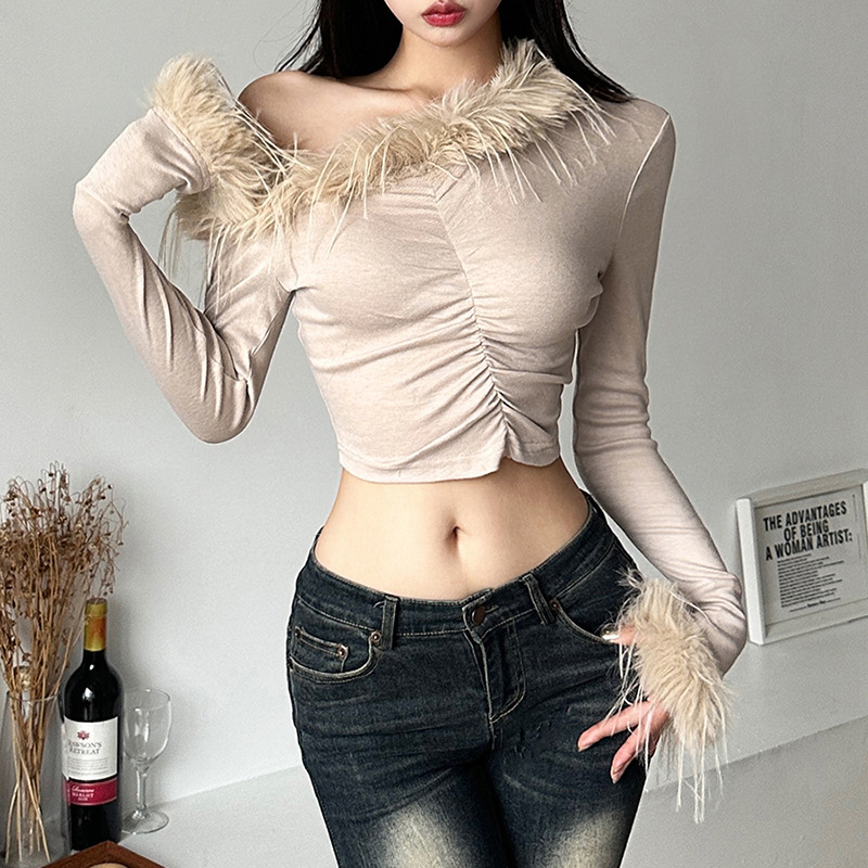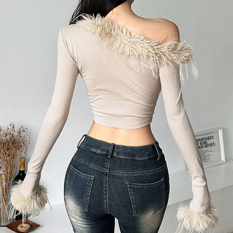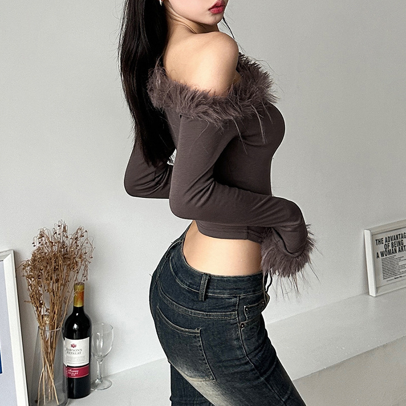 欧米のギャルのセクシーな毛は長袖のtシャツの女性の夏の新型のデザイン感をつなぎ合わせます。