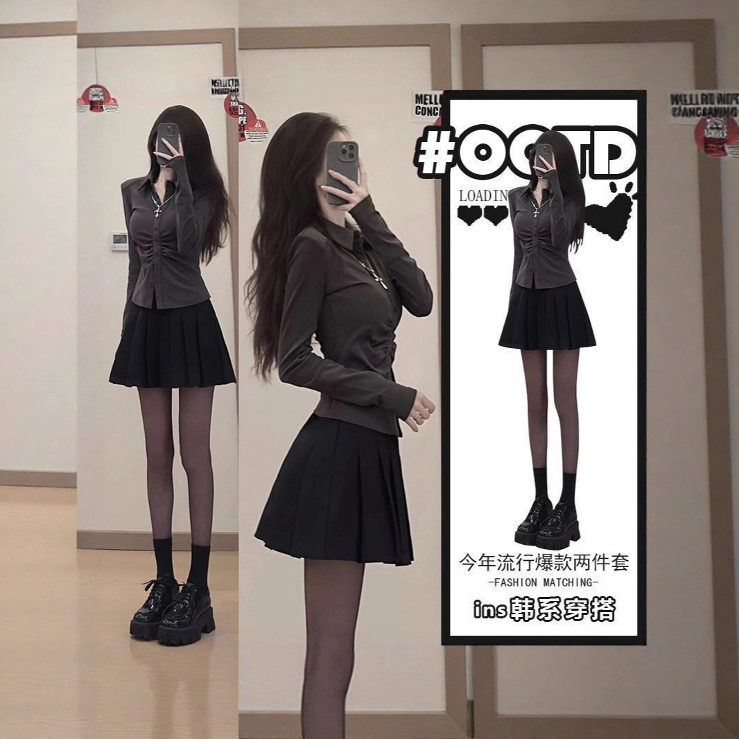 JK制服套装女春秋新款纯欲风辣妹修身皱褶衬衫高腰百褶裙两件套潮