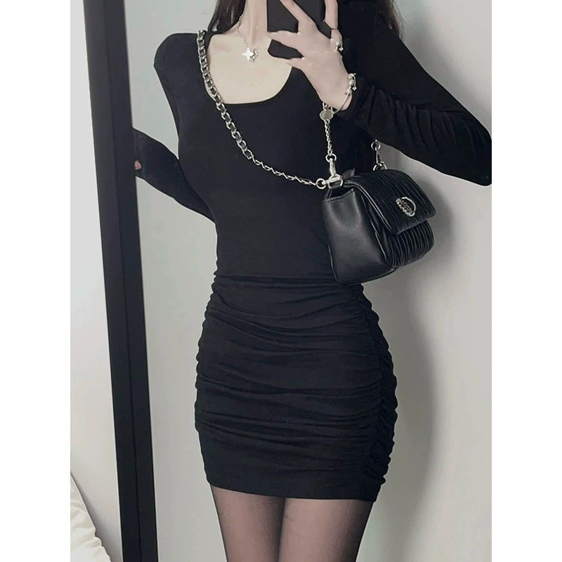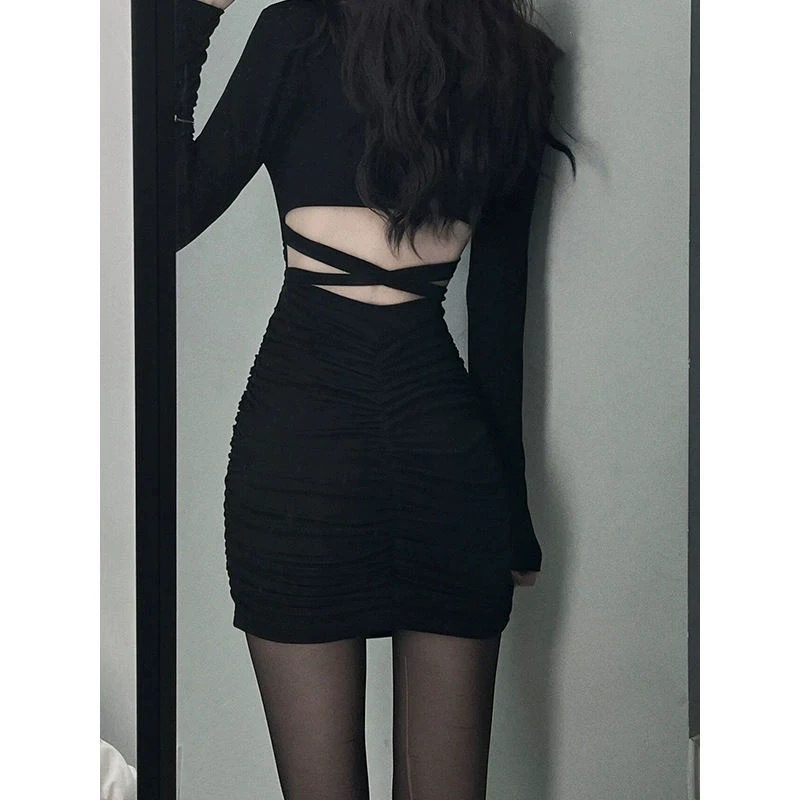 纯欲风辣妹长袖连衣裙女秋装小众设计感露背别致显瘦黑色包臀短裙