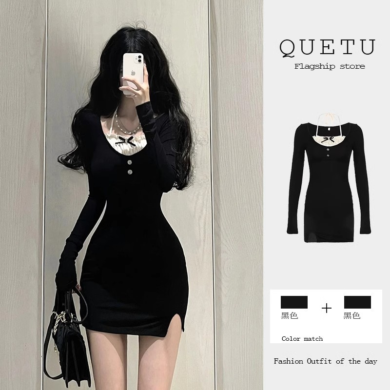 纯欲风假两件黑色连衣裙女春秋季新款修身显瘦小个子辣妹包臀短裙