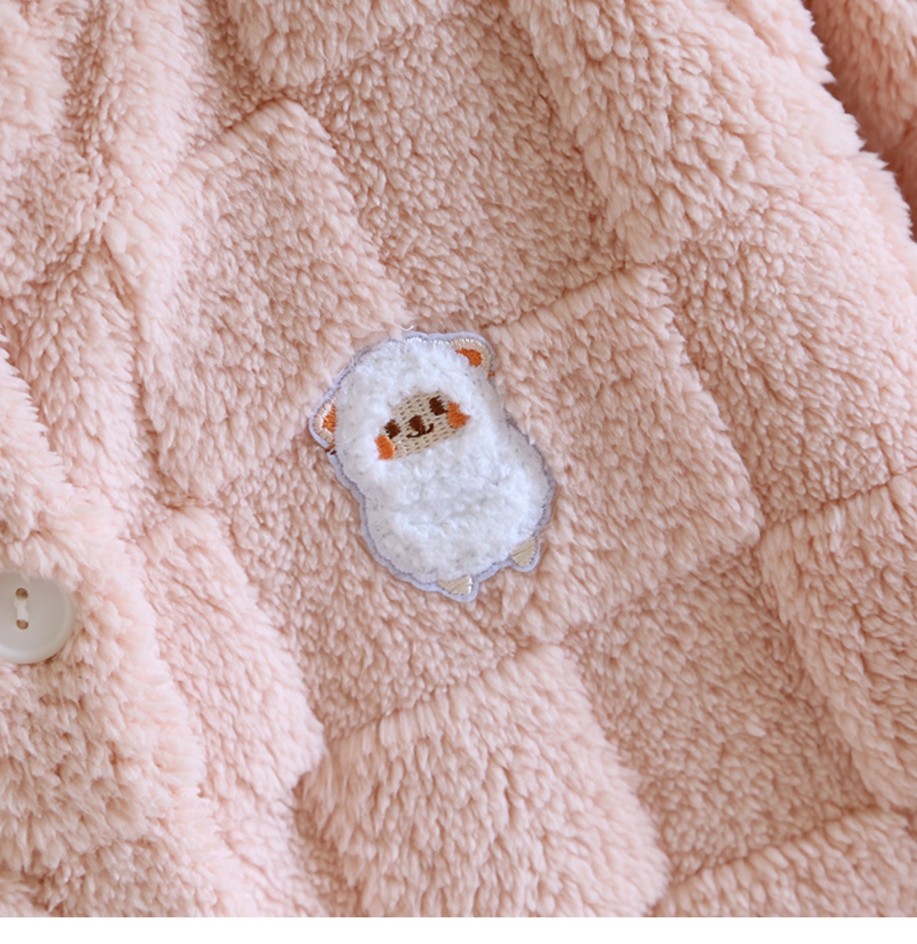 カップルのパジャマの羊の小毛セットの女性は冬にベルベットを厚くして、サンゴのベルベットの男性は帽子のジッパーで家の服を着ることができる