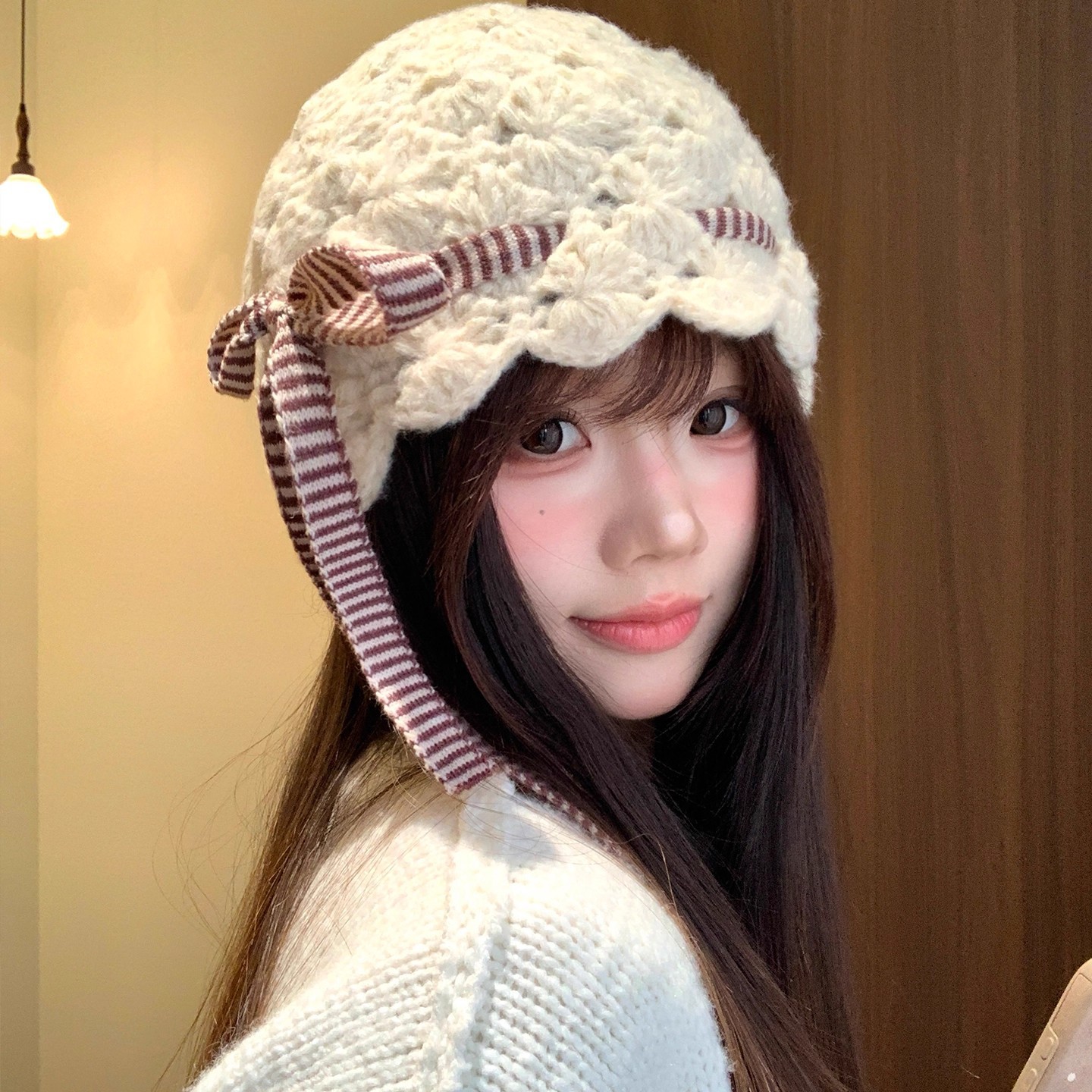 韩版2025新款甜美蝴蝶结飘带针织帽女秋冬季花朵显脸小毛线帽冷帽