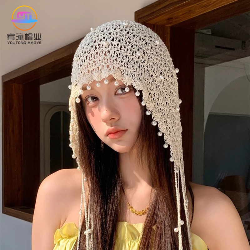 透かし彫り真珠流蘇ペンダント包頭帽子女性夏名族風ニット帽復古顔小帽子