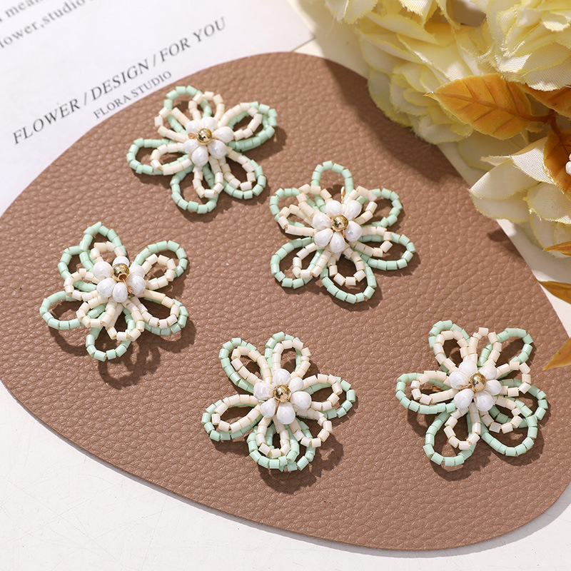 森系の清新な編み物の数珠の2色の透かし彫りの花diyの手のねじりの花の縁は胸の花の耳飾りのアクセサリーを挟みます。