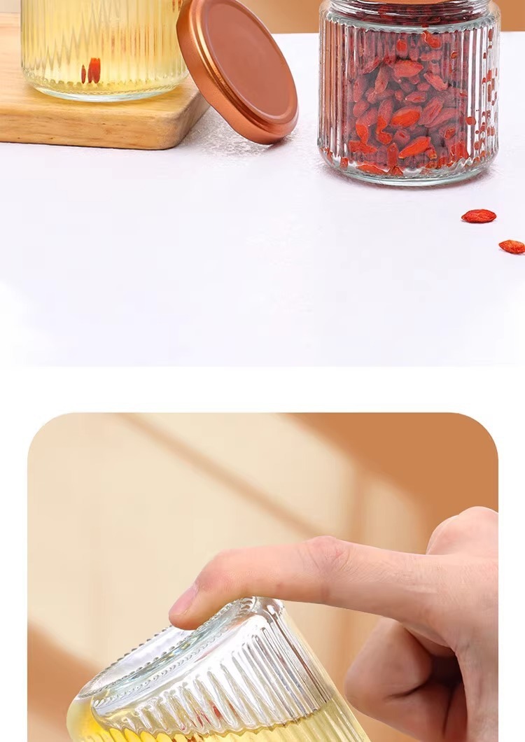 ツバメの巣の瓶の縦の紋様の瓶の透明な台所の漬物の瓶の厚い密封の蜂蜜のジャムのガラス瓶は瓶を分けて貯蔵する缶を詰めます。