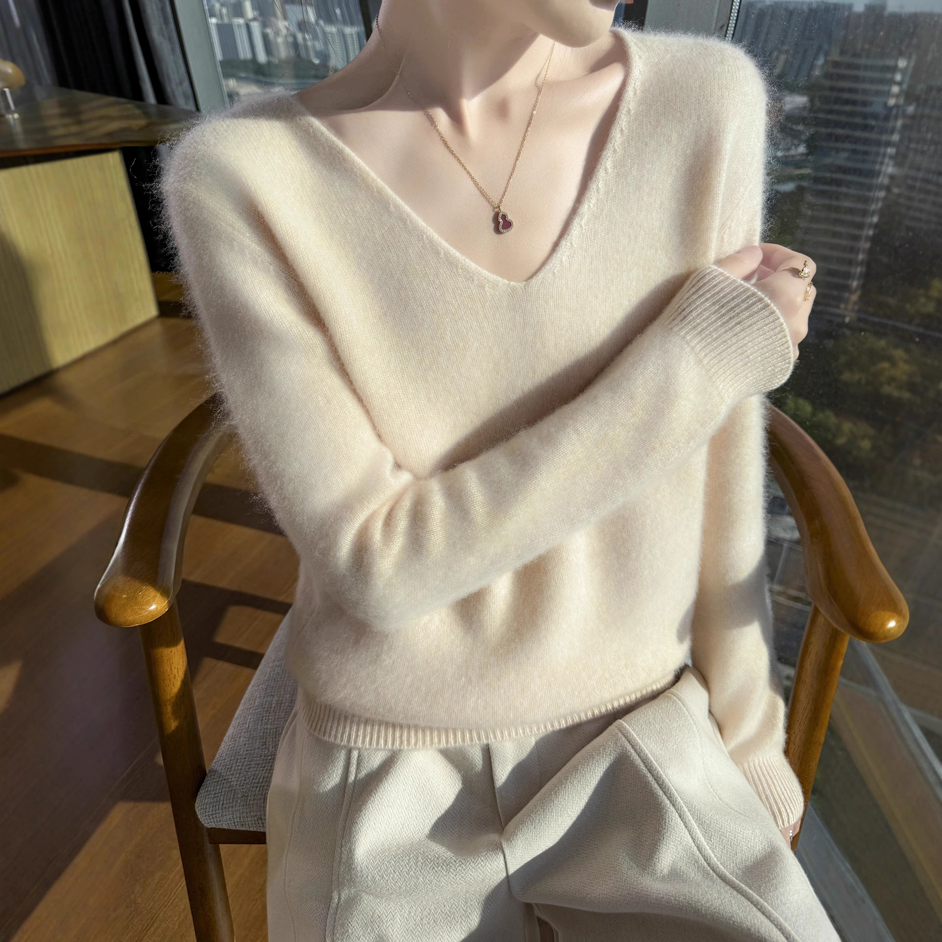 秋冬新款100%纯羊毛衫女加厚V领上衣针织打底衫宽松套头长袖毛衣
