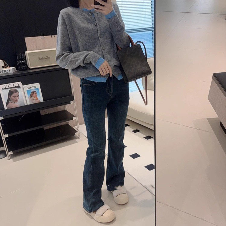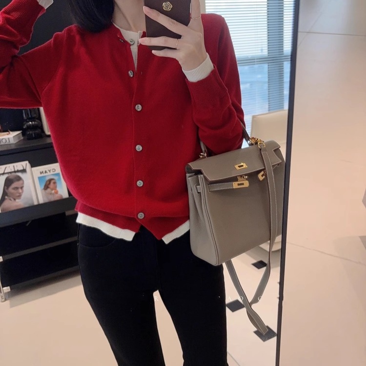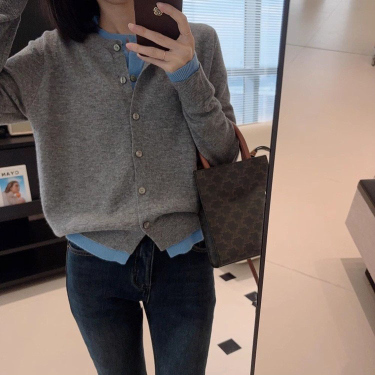设计感拼色假两件羊毛开衫女纯羊毛针织圆领毛衣外套打底上衣