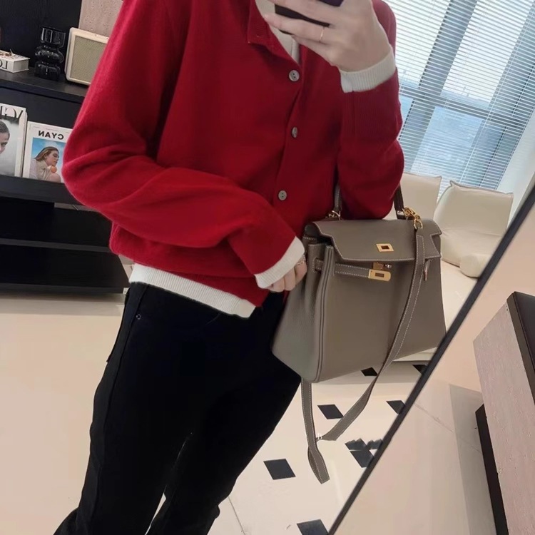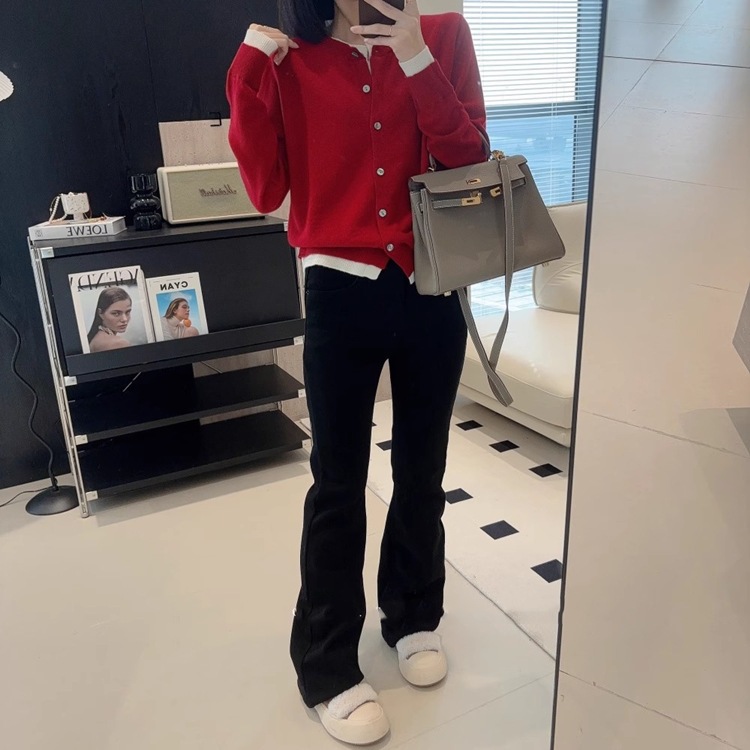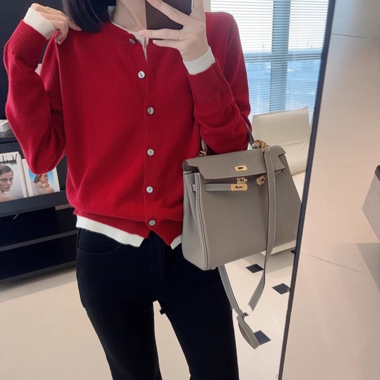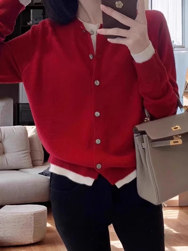 新年の赤い丸首の赤いカーディガン、女性用ヨーロッパ製秋冬カシミヤゆったり厚手ニットセータージャケット