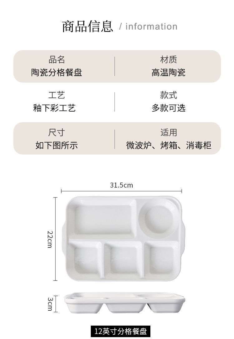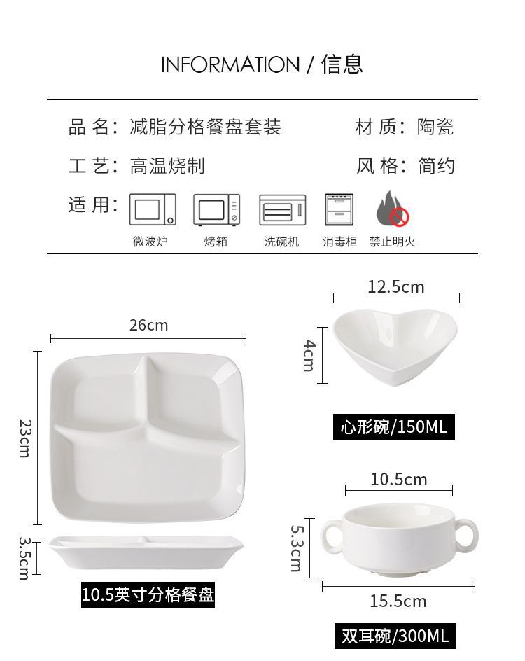 8.2inch 丸型グリッドプレート,9.5inch 丸型グリッドプレート,10inch 正方形のグリッド,12inch 4グリッドプレート,12inch 5グリッドプレート,白い両耳ボウル,白いハートのボウル,白い朝食カップ
