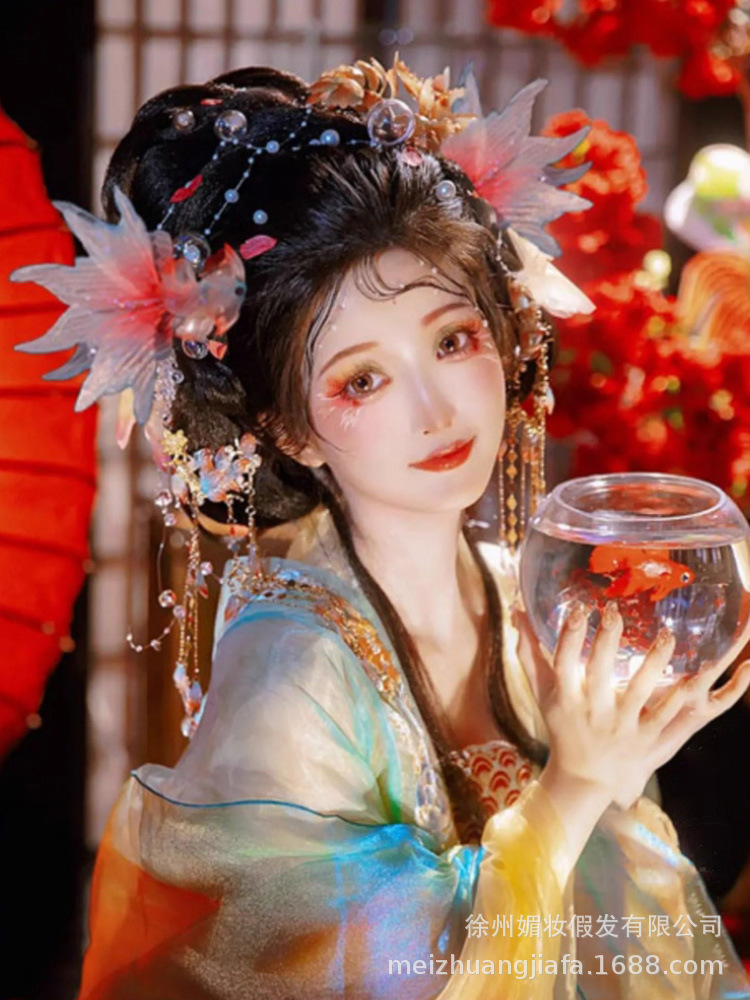 現物速発唐風唐宮夜宴同項発包演出古着漢服造形かつら赤縄兎耳髪