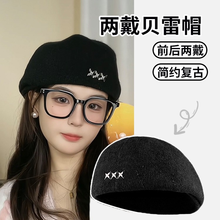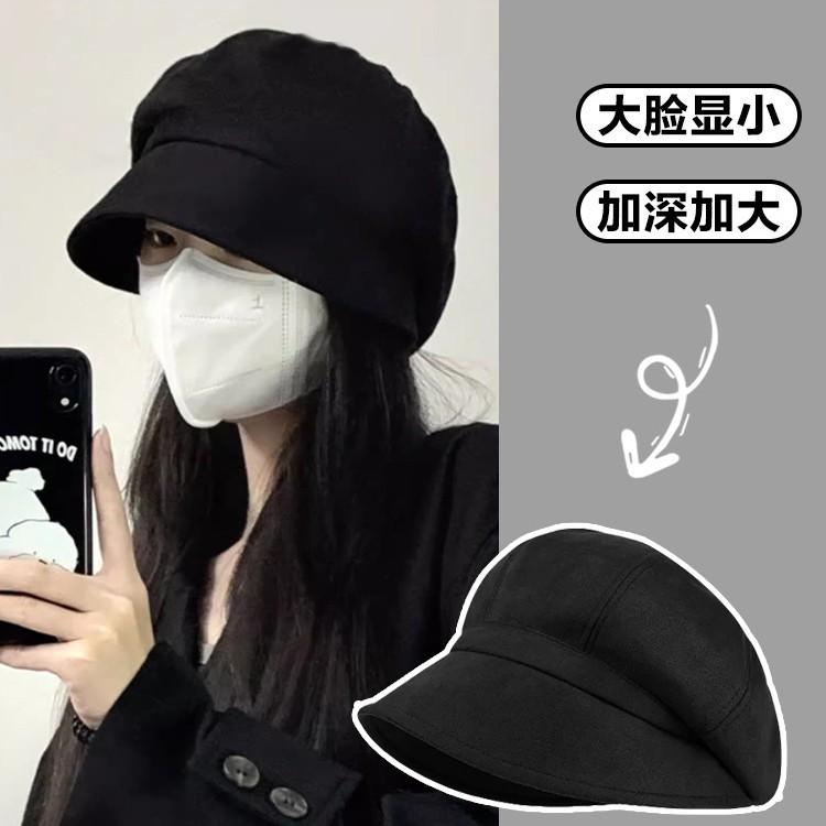 日系黑色贝雷帽女款2025新款秋冬大头围显脸小八角帽百搭画家帽子