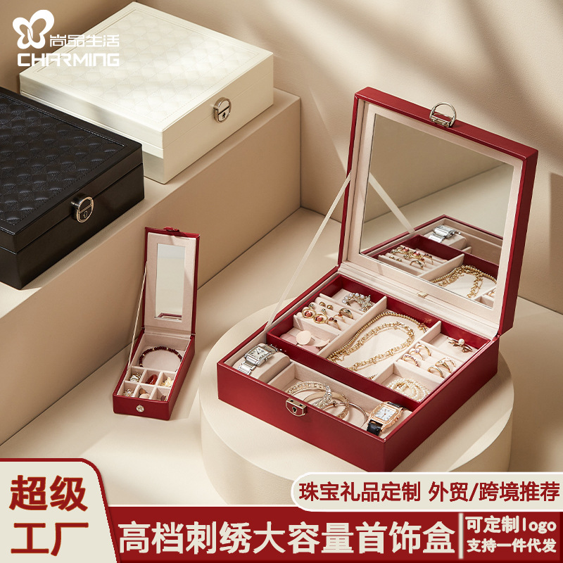クロスボーダー直送ジュエリー収納ボックス刺繍ロック付き大容量高価値ミラー付きレザージュエリーギフトボックス