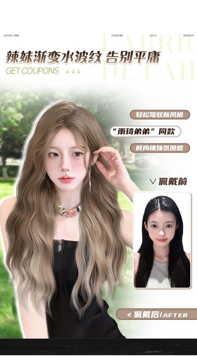 若蘭のかつらの女性の長い髪の長い巻き髪の自然な微巻の中で八の字の前髪の大きい波を分けて全体のカバー式を整えます。