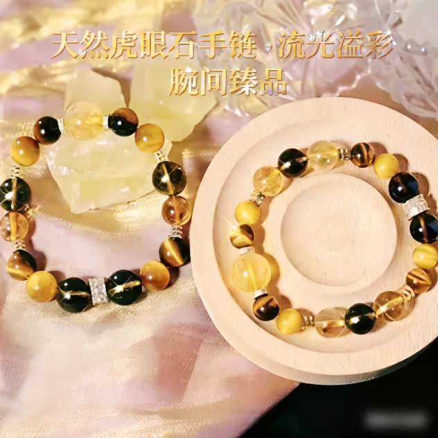天然シトリンブレスレット、ゴールデンクォーツビーズ、タイガーアイストーン、軽奢で高級感のあるビーズ、ニッチデザイン、ハンドメイド