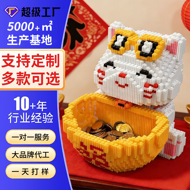 聚宝盆招财猫摆件大号拼装积木男女孩儿童益智玩具家庭客厅工艺品