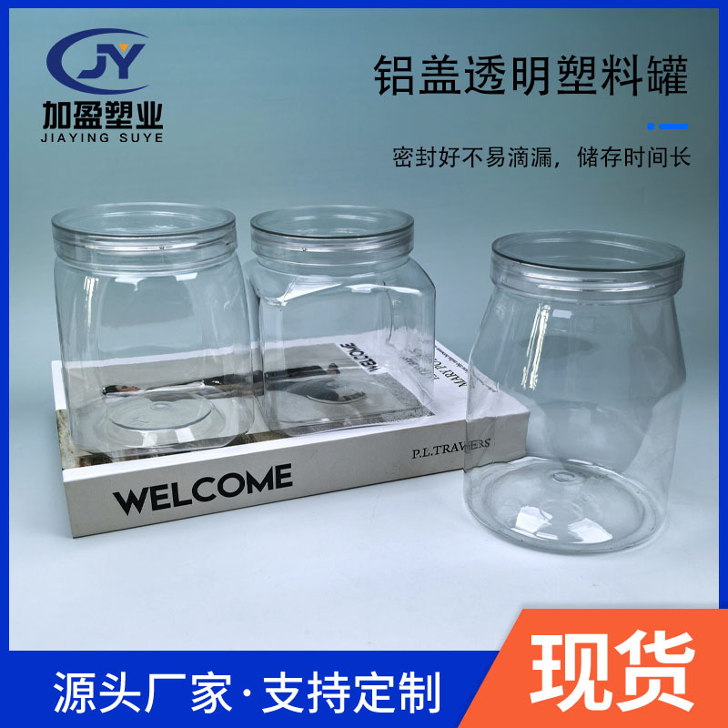 アルミ蓋付き透明プラスチック瓶、在庫あり卸売販売、貯蔵瓶、雑穀、ナッツ、スナック、蜂蜜密封瓶、PET広口瓶