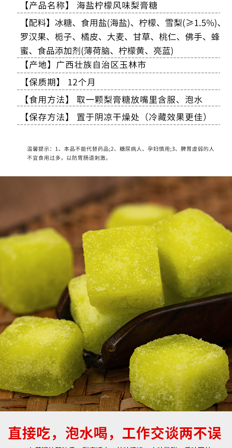 海塩レモン風味梨糖は水に浸して飲むことができ、個包装で持ち運びに便利な伝統的な小粒キャンディー、喉の潤いに効くキャンディーです。