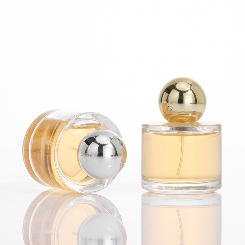 厚い底の香水瓶50mlの創意的な透明なアロマボトルのスプレーのボールの蓋は瓶を分けて卸売りして圧力式のスプレーの瓶を押します。