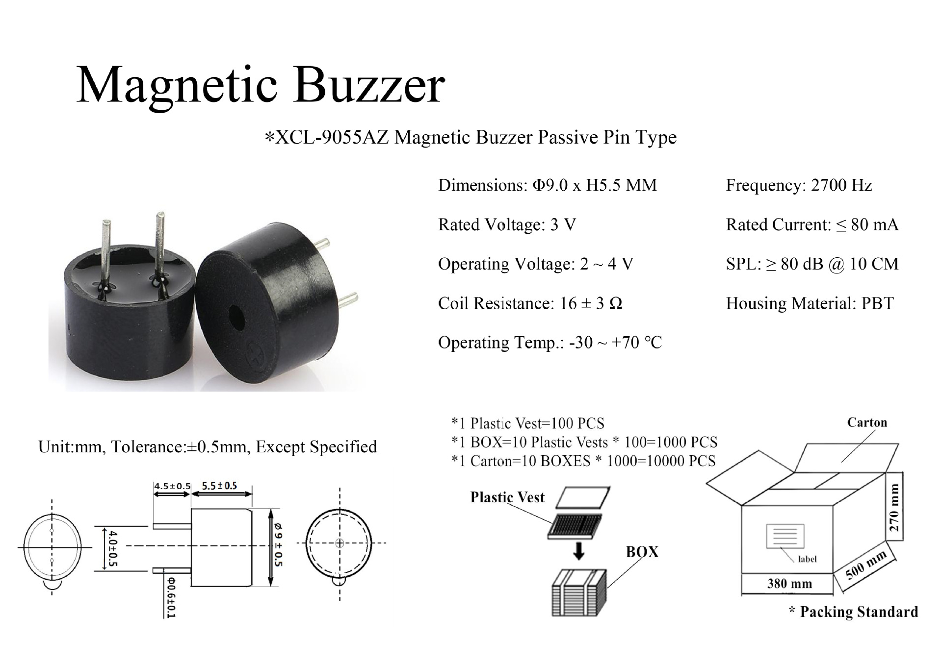 XCL-9042AZ 電磁パッシブブザー 5V42Ω/3V16Ω ピン 小容量 高さ4.2mm