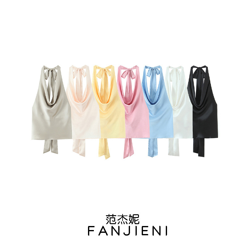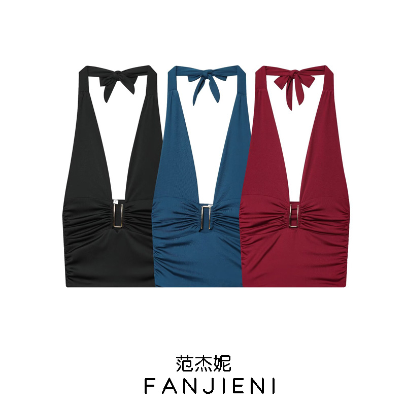 ZR外贸批发 欧美风 蝴蝶结系带金属贴花饰褶皱挂脖领上衣 1026625