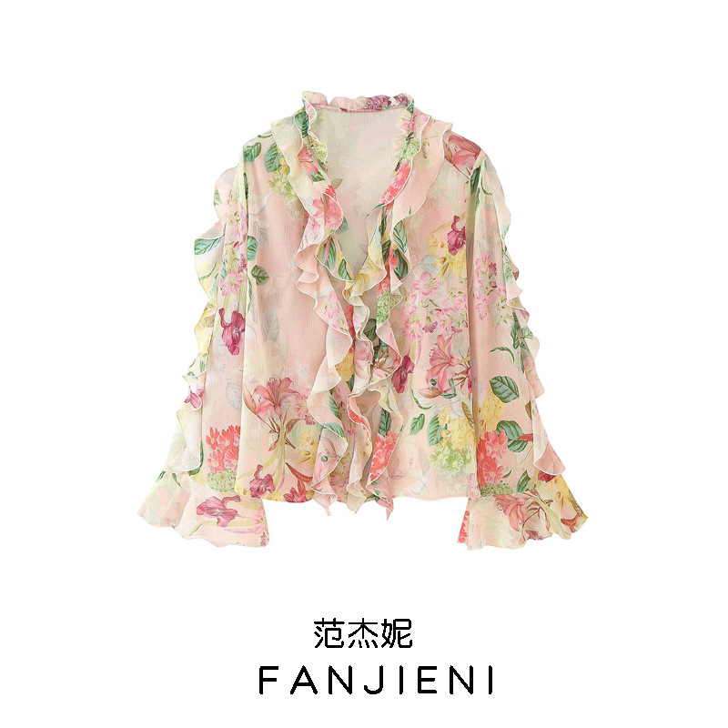 ZR外国貿易卸売り欧米風女装気質シンプルな花プリント積層飾り長袖シャツ3531317
