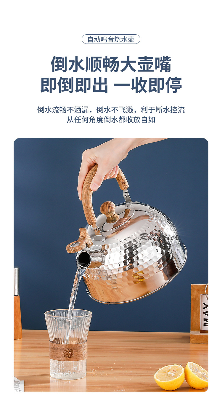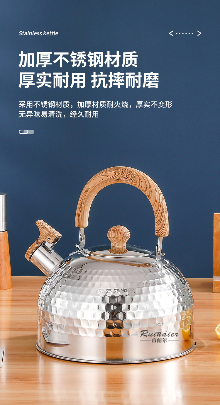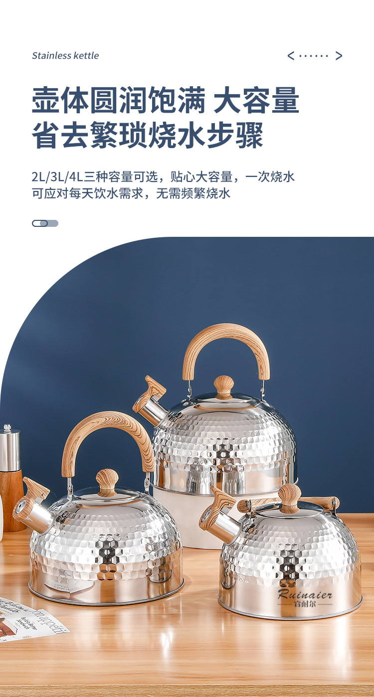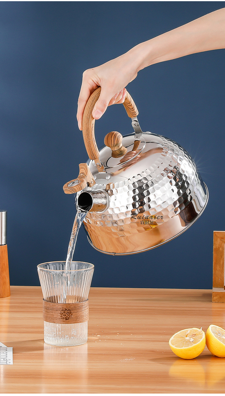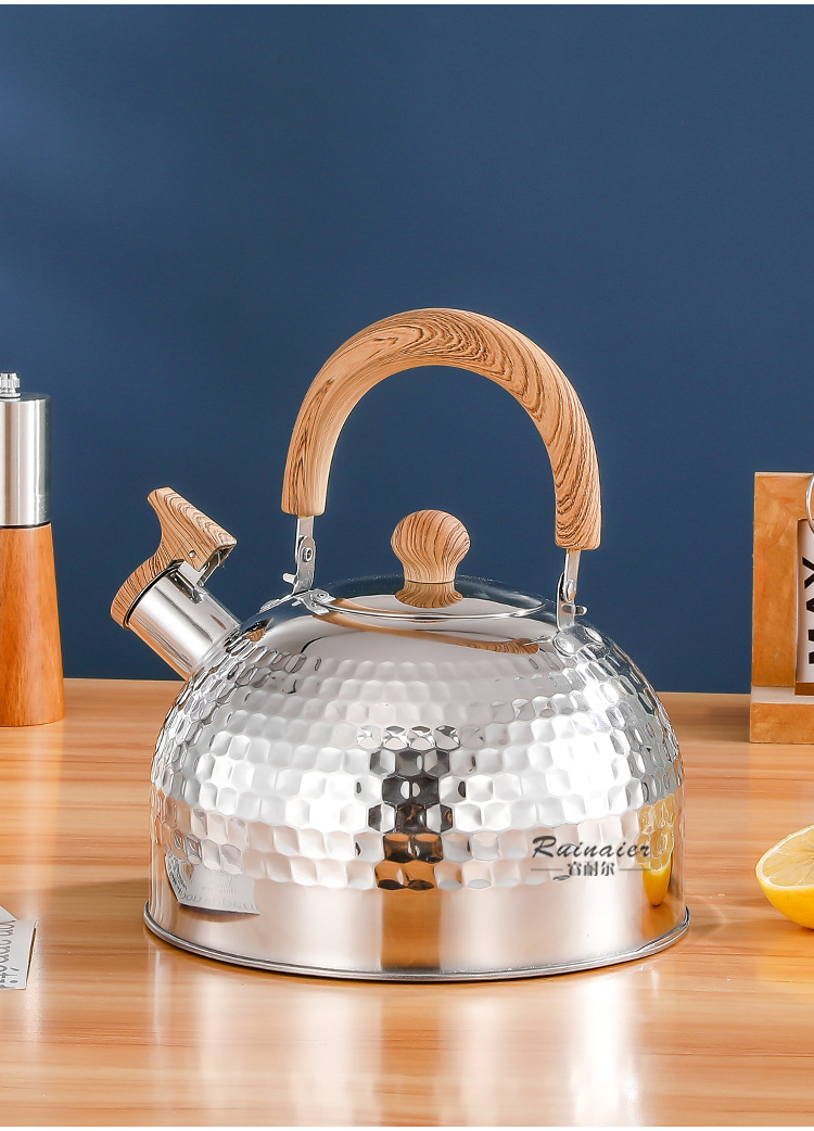 Ruinaier ステンレス鋼マルチカラーホイッスルケトル家庭用大容量平底ケトル槌目木製ハンドルホイッスルケトル
