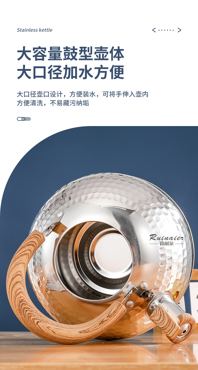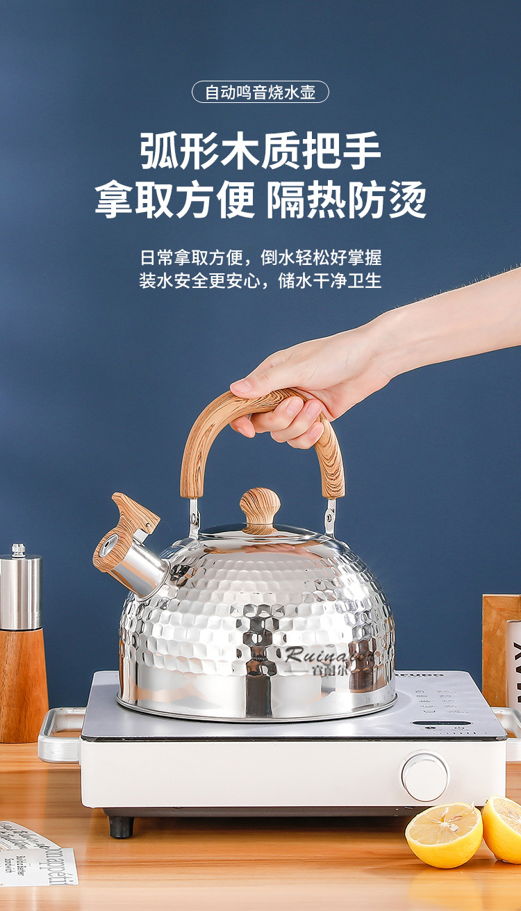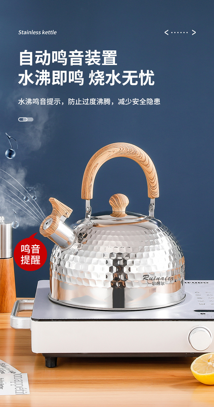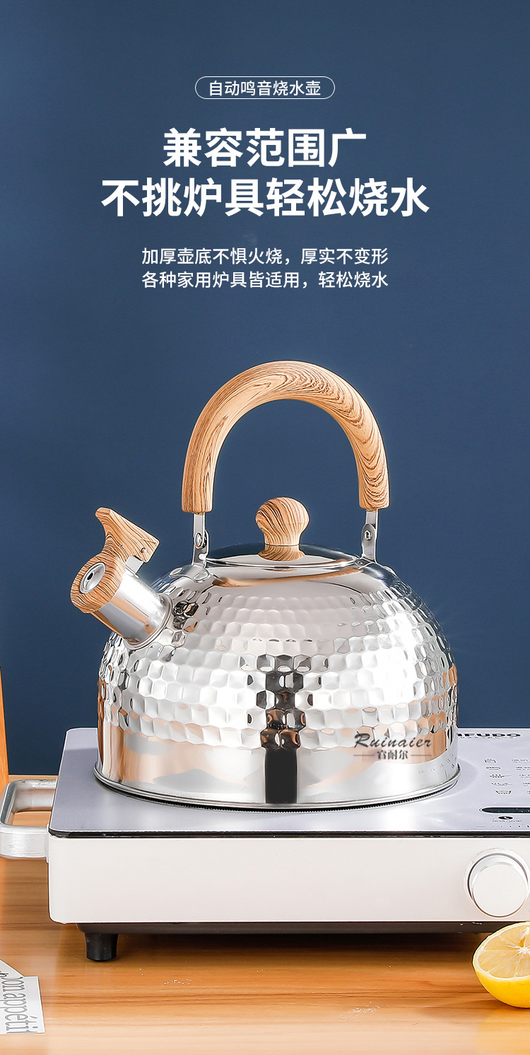 Ruinaier ステンレス鋼マルチカラーホイッスルケトル家庭用大容量平底ケトル槌目木製ハンドルホイッスルケトル