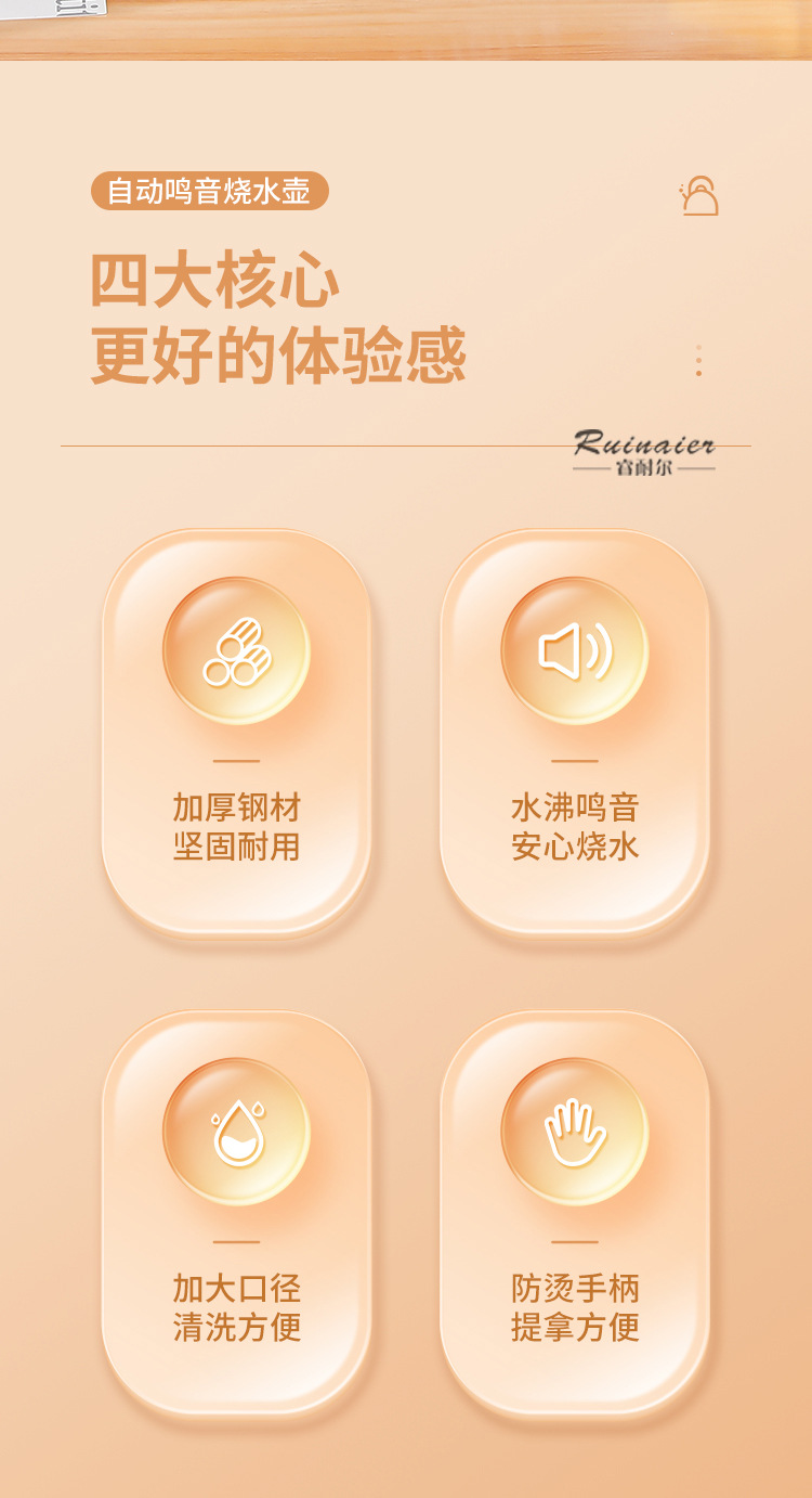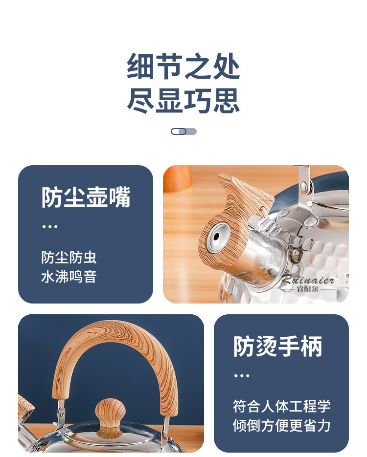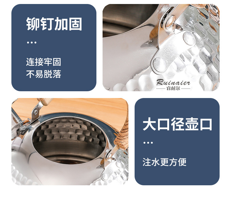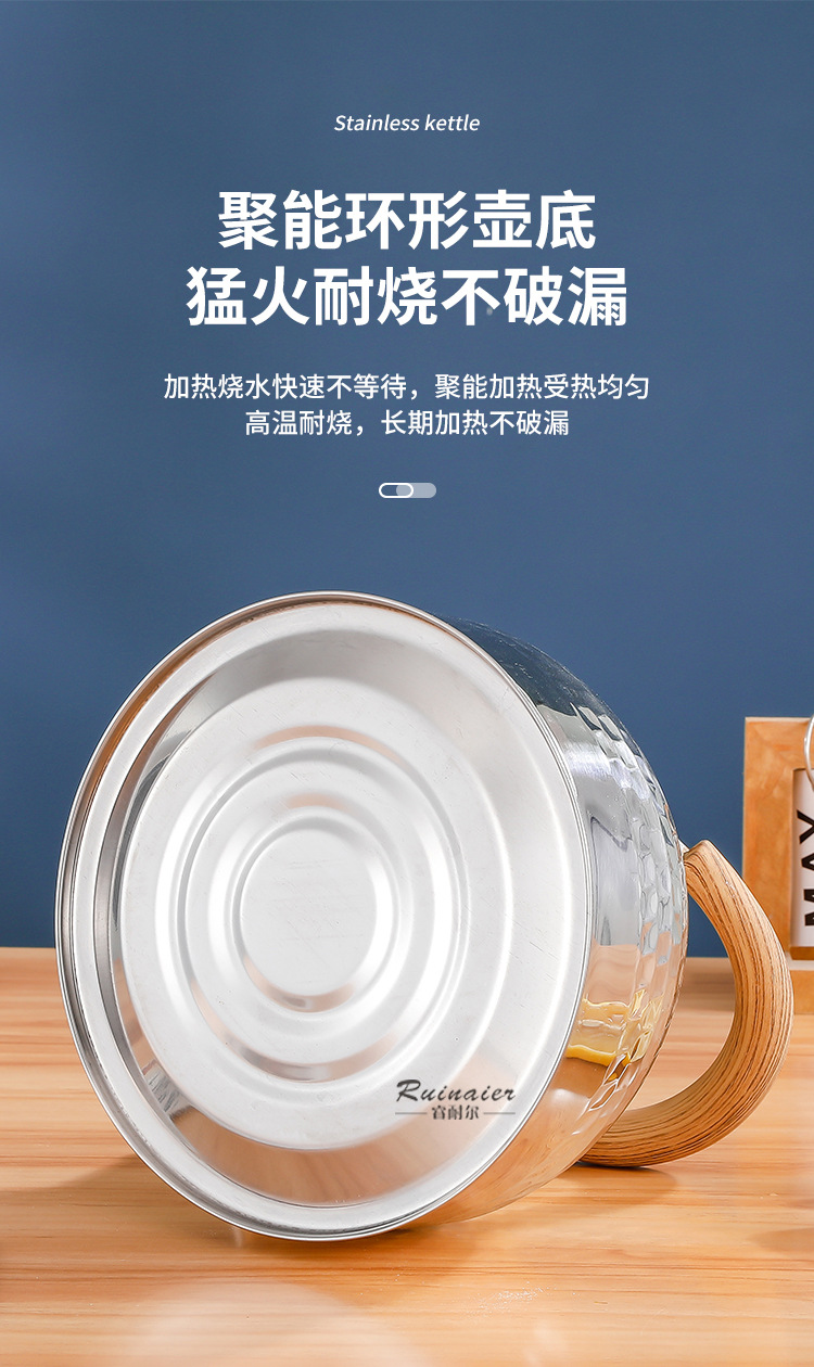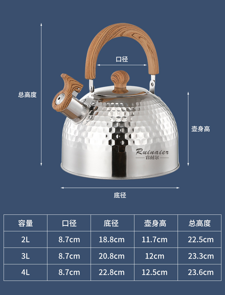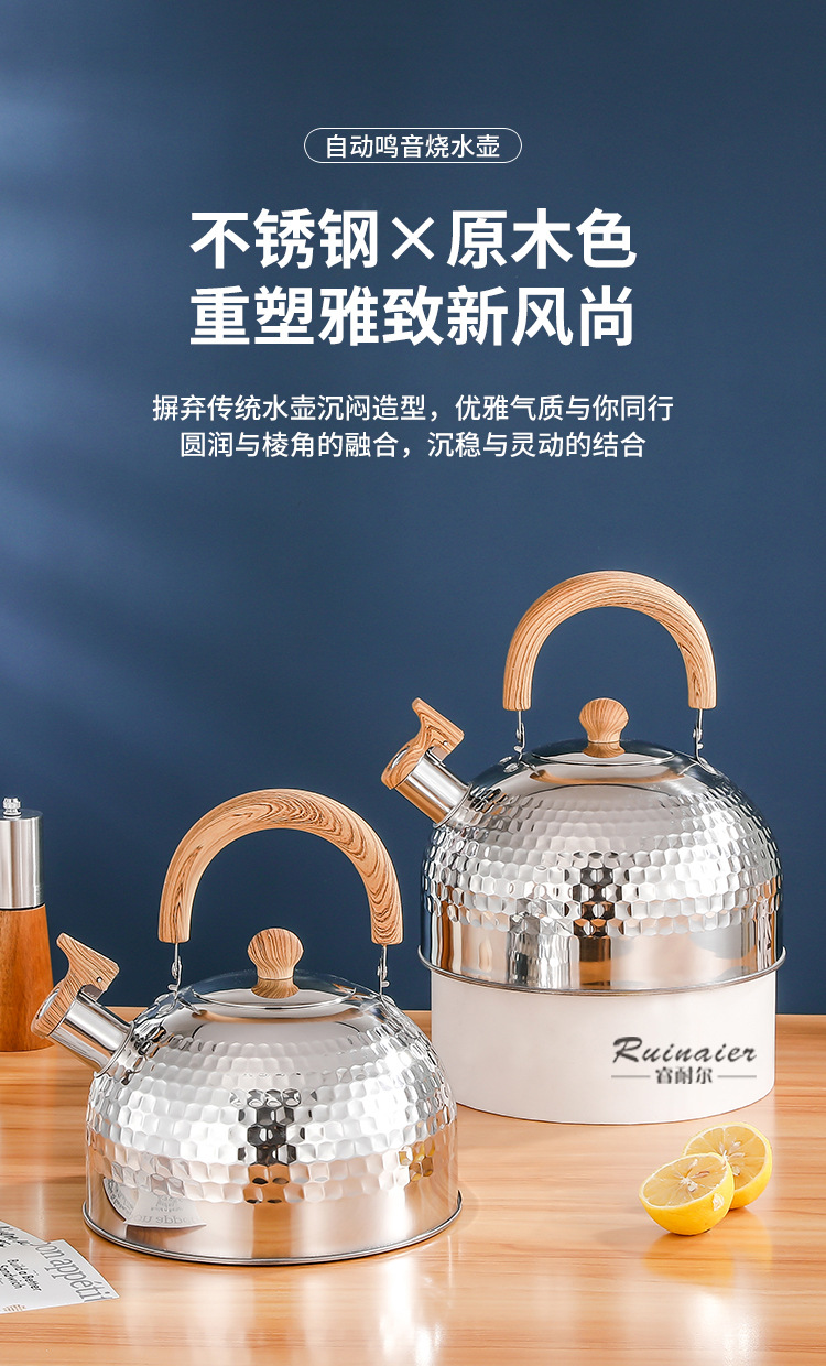 Ruinaier ステンレス鋼マルチカラーホイッスルケトル家庭用大容量平底ケトル槌目木製ハンドルホイッスルケトル