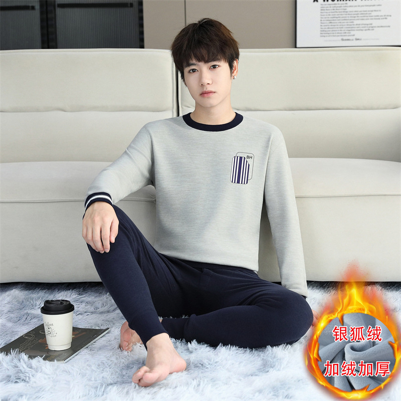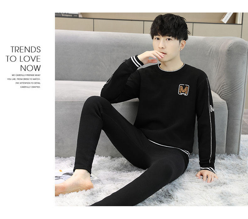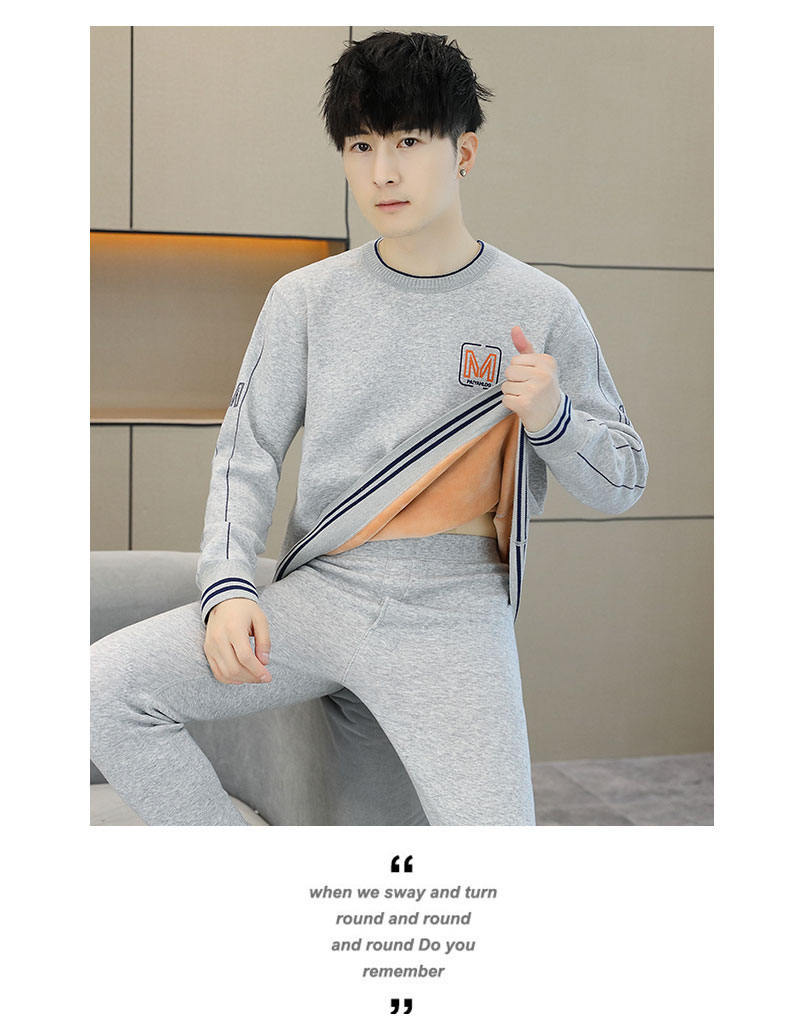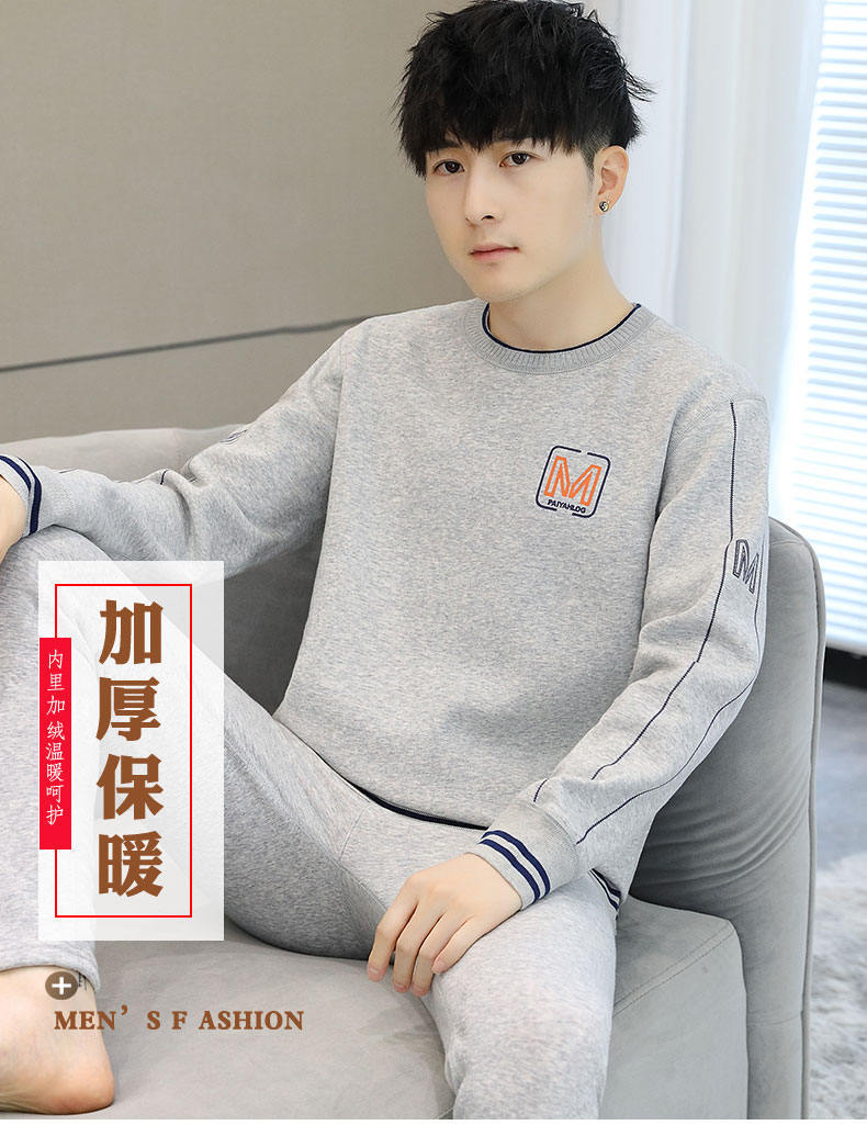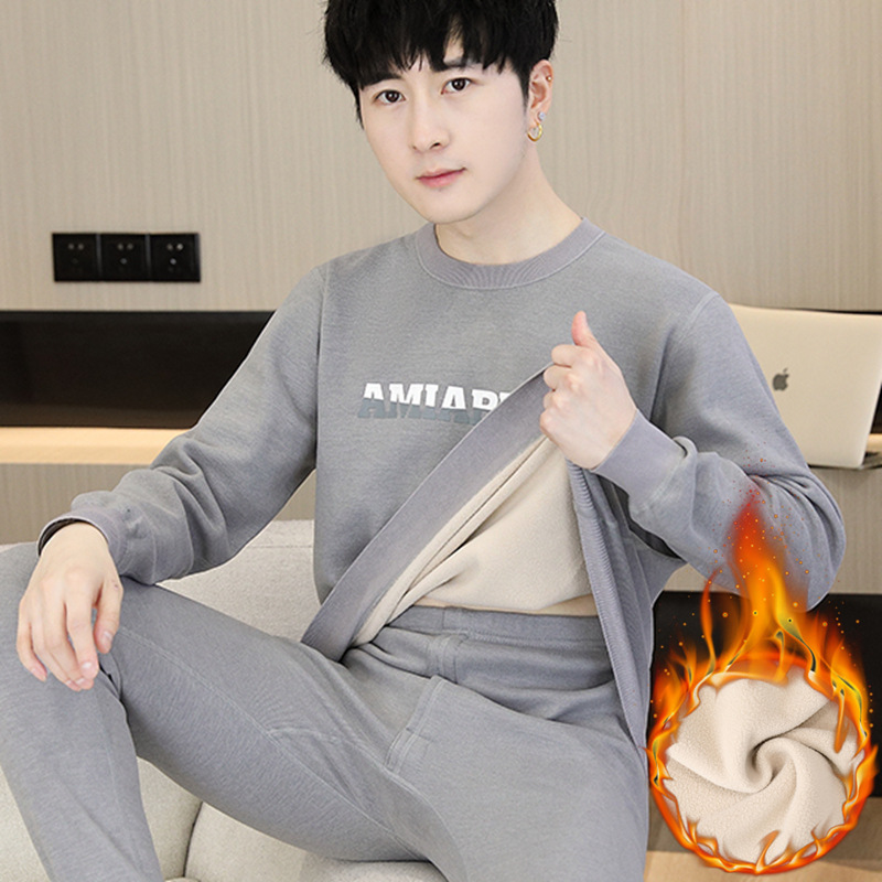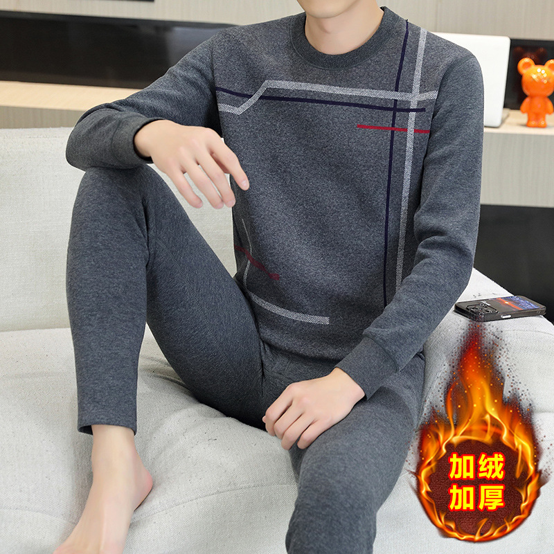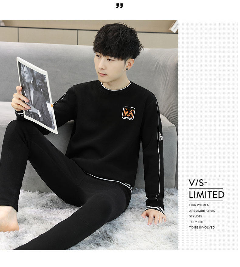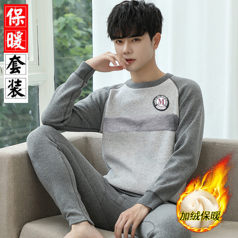 メンズ丸首とベルベットの厚い長袖保温下着セット潮青少年男性秋衣秋ズボン修身セット