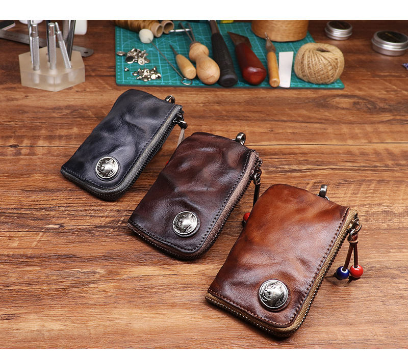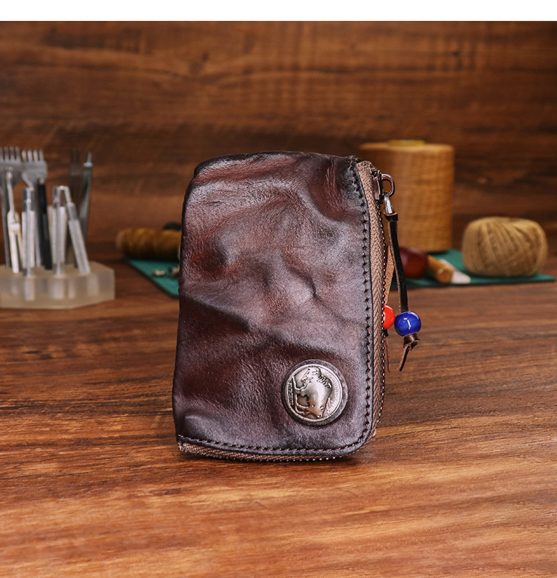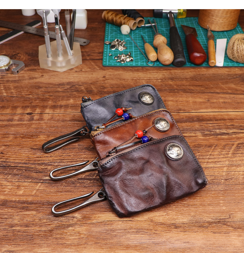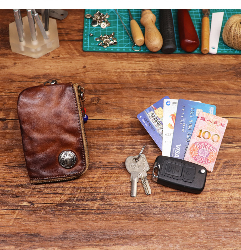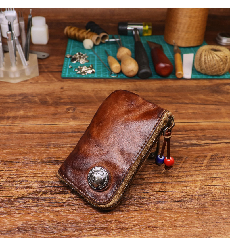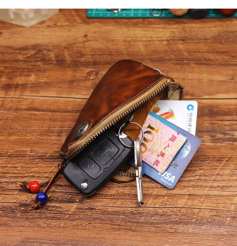 頭層植なめし革のキーホルダー女性が手で作った古い水洗い牛革の復古風ファスナー自動車のドア用キーホルダー男