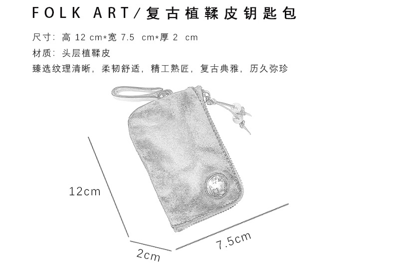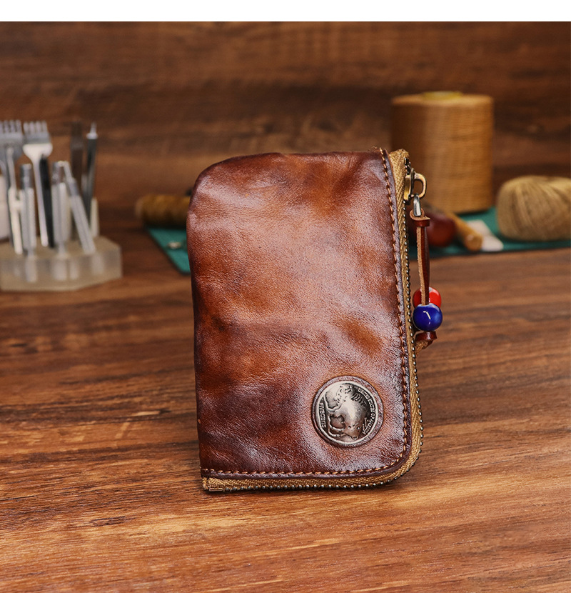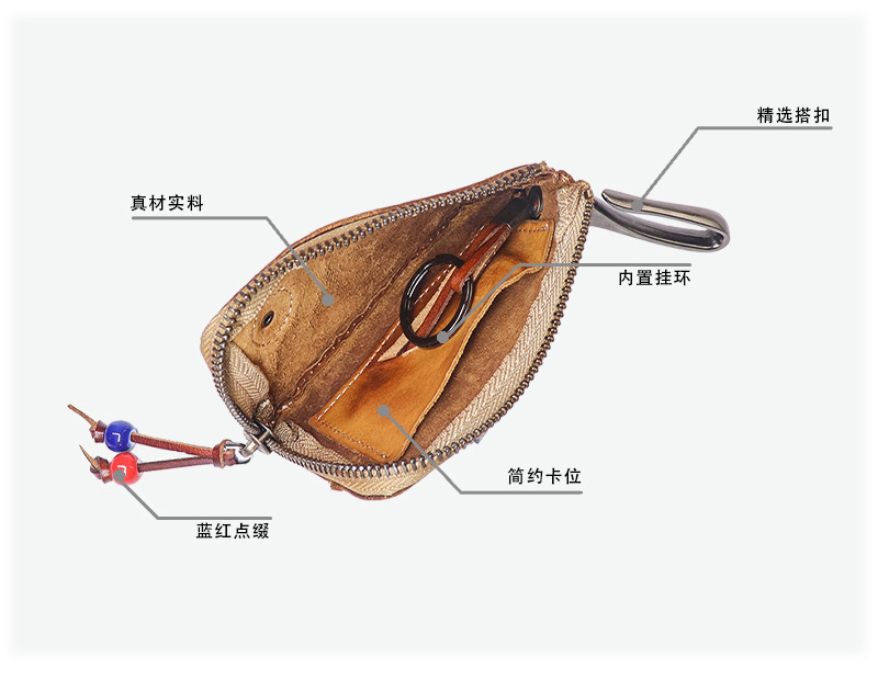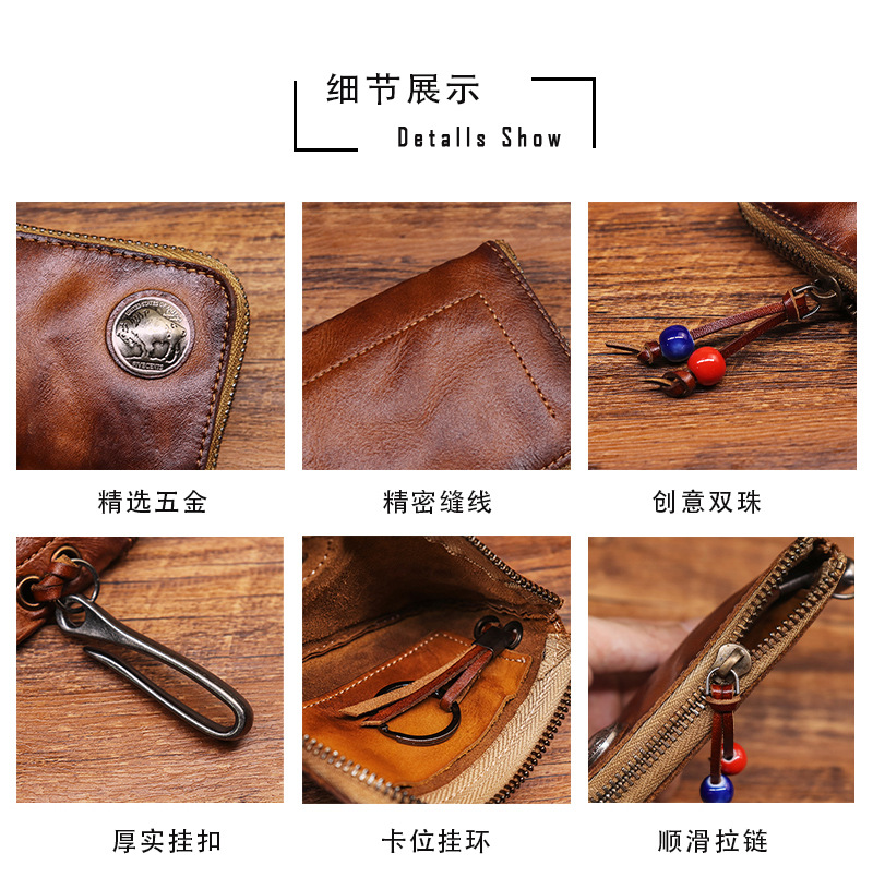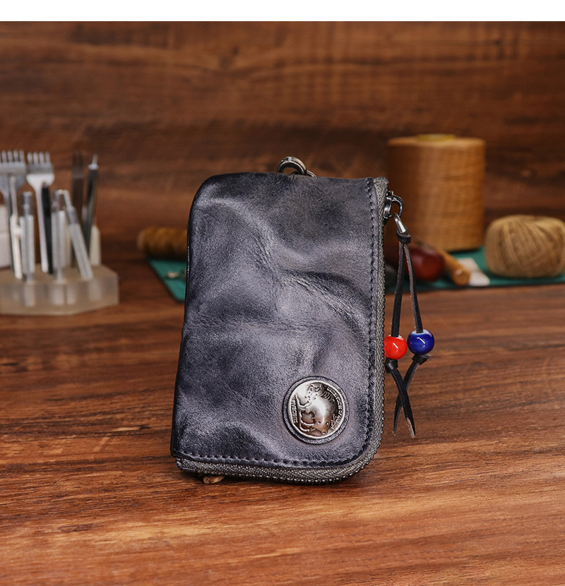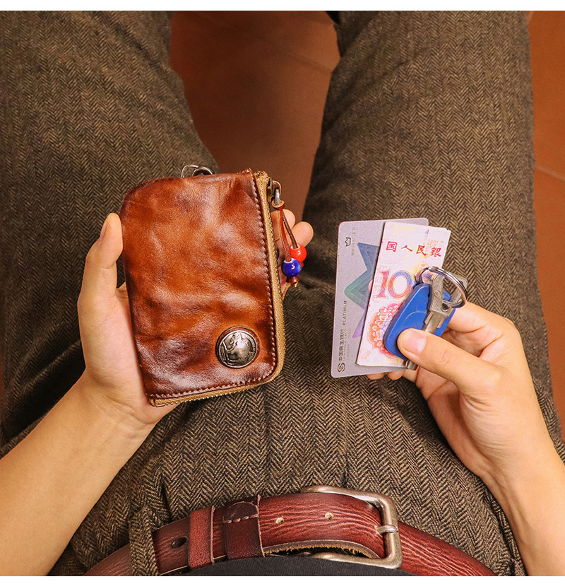 頭層植なめし革のキーホルダー女性が手で作った古い水洗い牛革の復古風ファスナー自動車のドア用キーホルダー男