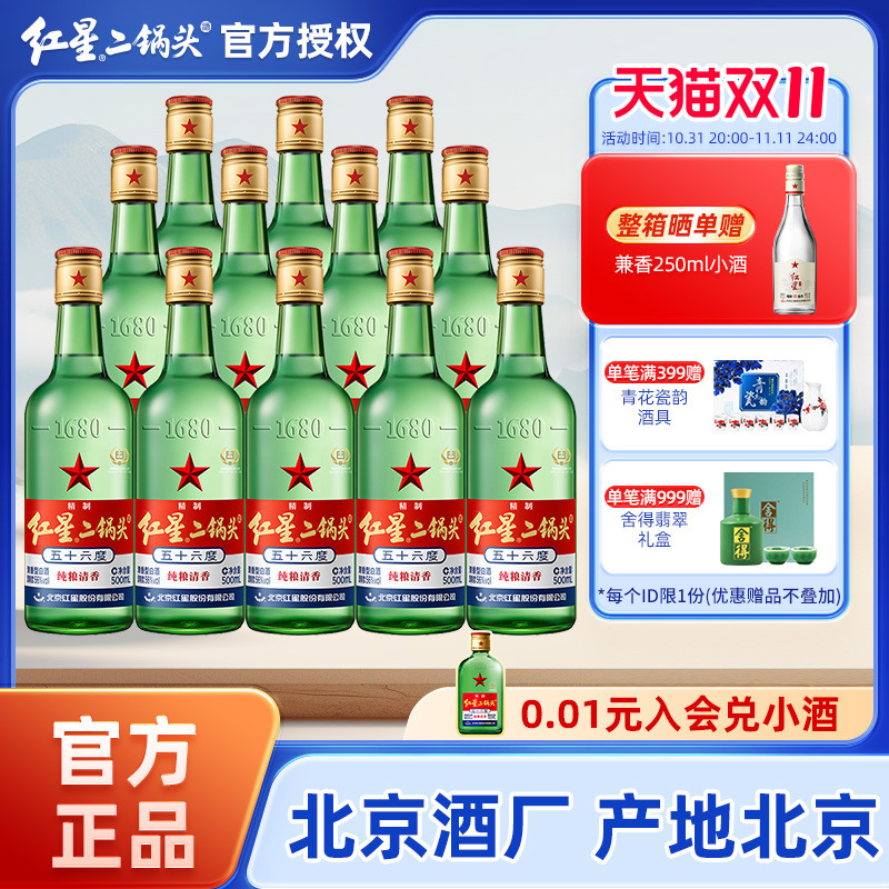 北京紅星二鍋頭56度500ml箱12本入り原箱清香型白酒紅星緑瓶大二