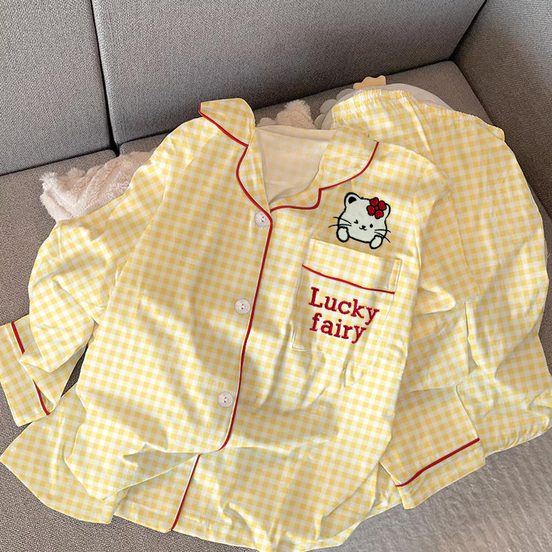 新しいシンプルなカジュアルチェック柄韓国パジャマ女性秋長袖ズボンホームウェアセット屋外で着用可能本物の写真卸売
